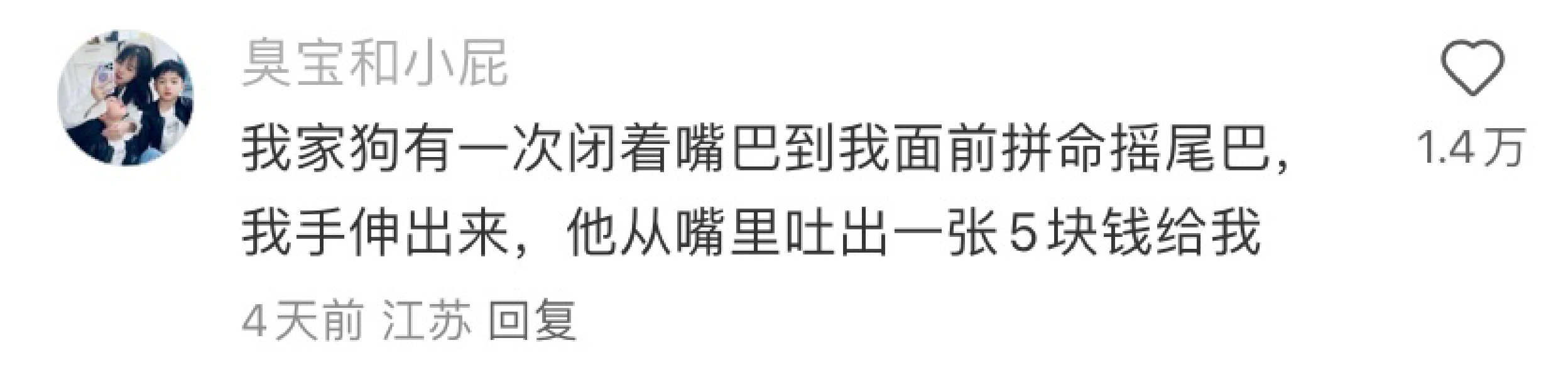 我家狗有一次闭着嘴巴到我面前拼命摇尾巴我手伸出来,他从嘴里吐出一张5块钱给我