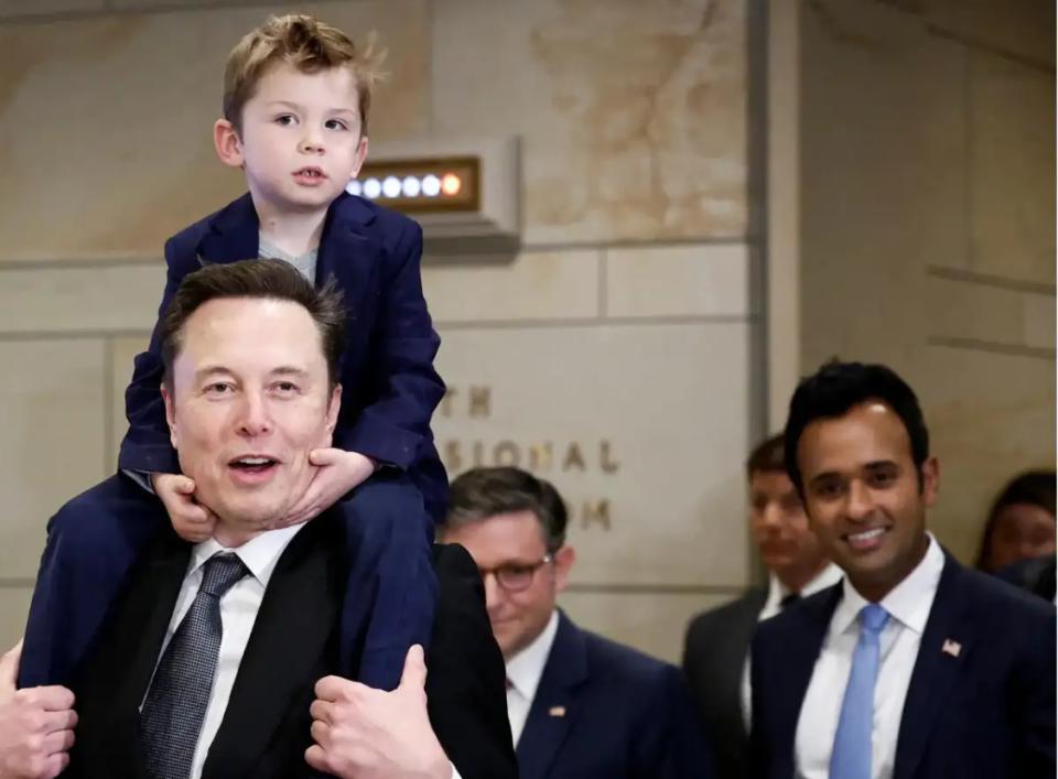 马斯克带娃赴迪拜。显然马总经常带小儿子出来,小儿骑在马总肩上,也甚是可爱。