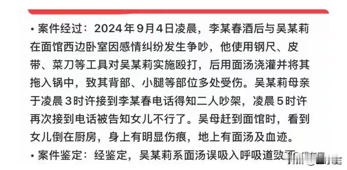 灌面汤呛死妻子案被判死缓,几乎是意料之中的!从他儿女为父亲求情那一刻,就已经没什么悬念了。 关注这个案子那么久,想到那些相关细节,至今让人无比心疼。 受害者吴莉同李杨春是20年的夫妻,二人育有一女一儿。当初,因李杨春穷困潦倒,吴莉的家人并不赞成他们在一起。最终,是吴莉力排众议坚持要嫁给他。 这十几年的风风雨雨,吴莉任劳任怨,一边带孩子,一边打工,陪着李杨春四处奔波。 前两年,夫妻俩才攒下一点钱回到老家,日子才刚刚好起来一些,悲剧就发生了。 根据官方通报,2024年9月3日晚,吴莉和李杨春因琐事在面馆的卧室发生争执,李杨春对吴莉实施了殴打,接着,又将她拖至厨房,对她浇灌了面汤。最终,可怜的吴莉因呼吸道吸入面汤而窒息身亡。 按道理来说,男人最该珍惜的是那个当初陪自己一起吃苦的女人。而李杨春以如此残忍的方式,对待自己的枕边人,实在大错特错! 2025年12月12日,该案一审宣判,李杨春被判死刑,缓期两年执行! 这个结果,引来了很大争议,很多朋友纷纷不解?为什么如此残忍的作案情节,李杨春却逃过了死刑立即执行呢? 主要源于三个方面: 第一:李杨春有自首情节。 案发后,李杨春没有逃跑。他主动投案自首,如实交代了自己的罪行! 他这一举动,符合了我国刑法规定的自首情节,可依法获得从轻、减轻处罚。 第二:被害人有一定过错。 案发后,法院查明受害者生前在婚姻内有不当交友行为,被发现以后,夫妻二人因这些事情引发了矛盾。 我国《刑法》第5条规定了罪责刑相适应原则,也就是说如受害者有一定过错的话,是会影响到犯罪分子量刑的。 第三:李杨春的家属出具了谅解书。 悲剧发生后,李杨春的子女以不想做孤儿为由,谅解了父亲的所作所为。为了替父亲争取轻判,他的子女还去求了姥姥一家。 家属一方出具了谅解书后,法院在对其量刑时也会酌情考虑。 综上所述,李杨春之所以被判死缓,除了他有自首情节,被害人有一定过错,家属的谅解书也成了至关重要的一环! 事实上,这样的结果并不意外,从子女为他求情那一刻开始,似乎就没有悬念了! 在这个事件里,没有一方是赢家。 最可怜的要属受害者吴莉,她辛辛苦苦养大的孩子,没有一个能共情她。李杨春此举不仅让自己20年的努力打拼毁于一旦,也毁掉了自己的家。 现在,他的面馆招牌都已经被卸下,当初所有的一切都不复存在了。他虽躲过了死刑立即执行,但此生的后半辈子,恐怕也要在牢里度过了! 人啊!凡事都要善良一点,夫妻之间有矛盾是再正常不过的了。不管经历了什么,都要用理性的方式来化解。一日夫妻百日恩,即便无法再一起过下去,也要做到体面分开! 做不成夫妻,可做朋友,毕竟还有共同的孩子!大家说,如此一来是不是会更好呢?