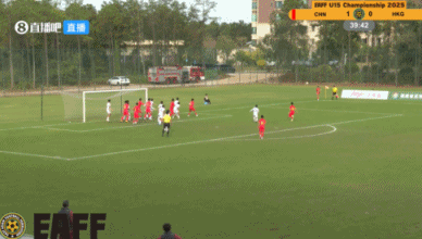 第39分钟,中国U15队利用角球机会打入一球,不过主裁判示意越位在先,进球无效。↓