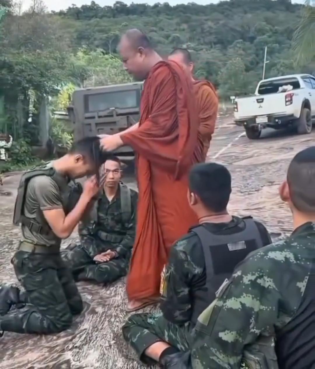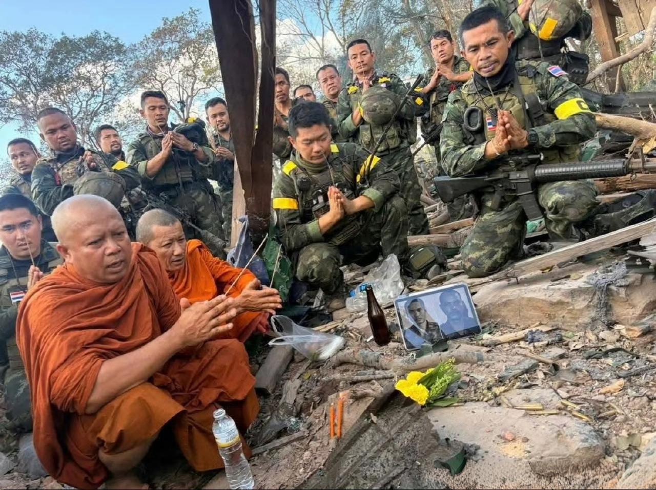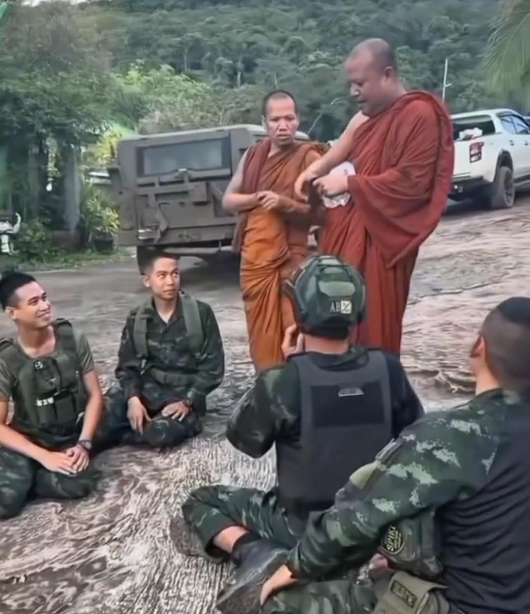泰国僧侣的爱国情感!泰国僧侣在占领的柬埔寨阵地上,为阵亡士兵超度。 泰国僧侣于2025年12月上旬频繁现身泰柬边境冲突区(如素林府、武里南府),向士兵分发经咒开光的护身符、佛牌等吉祥物。部分仪式中,僧侣诵经洒圣水为武器“开光”,声称可庇佑士兵“无惧枪炮”。并且亲赴交战一线,为牺牲的泰国士兵超度,为泰军前线官兵祈福。