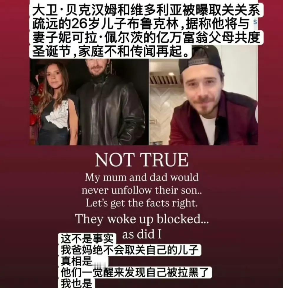 真就家家有本难念的经!贝克汉姆和维多利亚一觉醒来,直接被大儿子布鲁克林全网拉黑了,连带着俩弟弟也没逃过这波操作。 老三克鲁兹还特意转发媒体吐槽:爸妈从来没取关过儿子,是真真切切被拉黑的!更绝的是,布鲁克林圣诞压根不回自家过,直奔老婆的亿万富翁娘家。 说起来这矛盾早有苗头,2022年结婚不穿贝嫂品牌婚纱就埋下雷,后来连小贝50岁生日都缺席。只能说娶了媳妇忘了爹妈这事,放谁家都闹心啊!