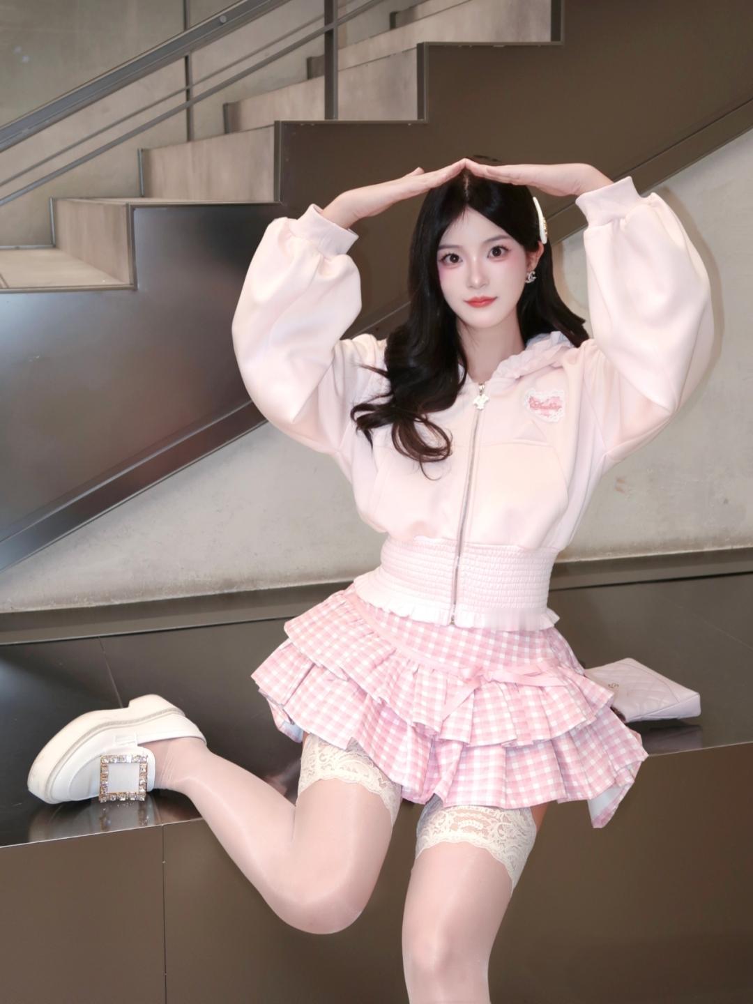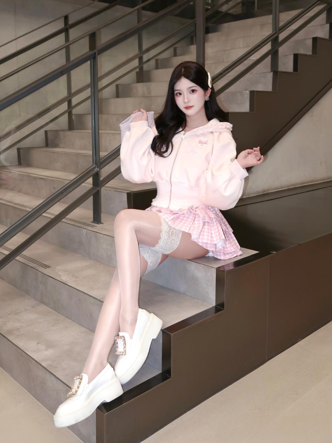 梦幻少女风,粉色毛衣搭配蕾丝短裙,坐上楼梯,甜美可爱!💖✨
