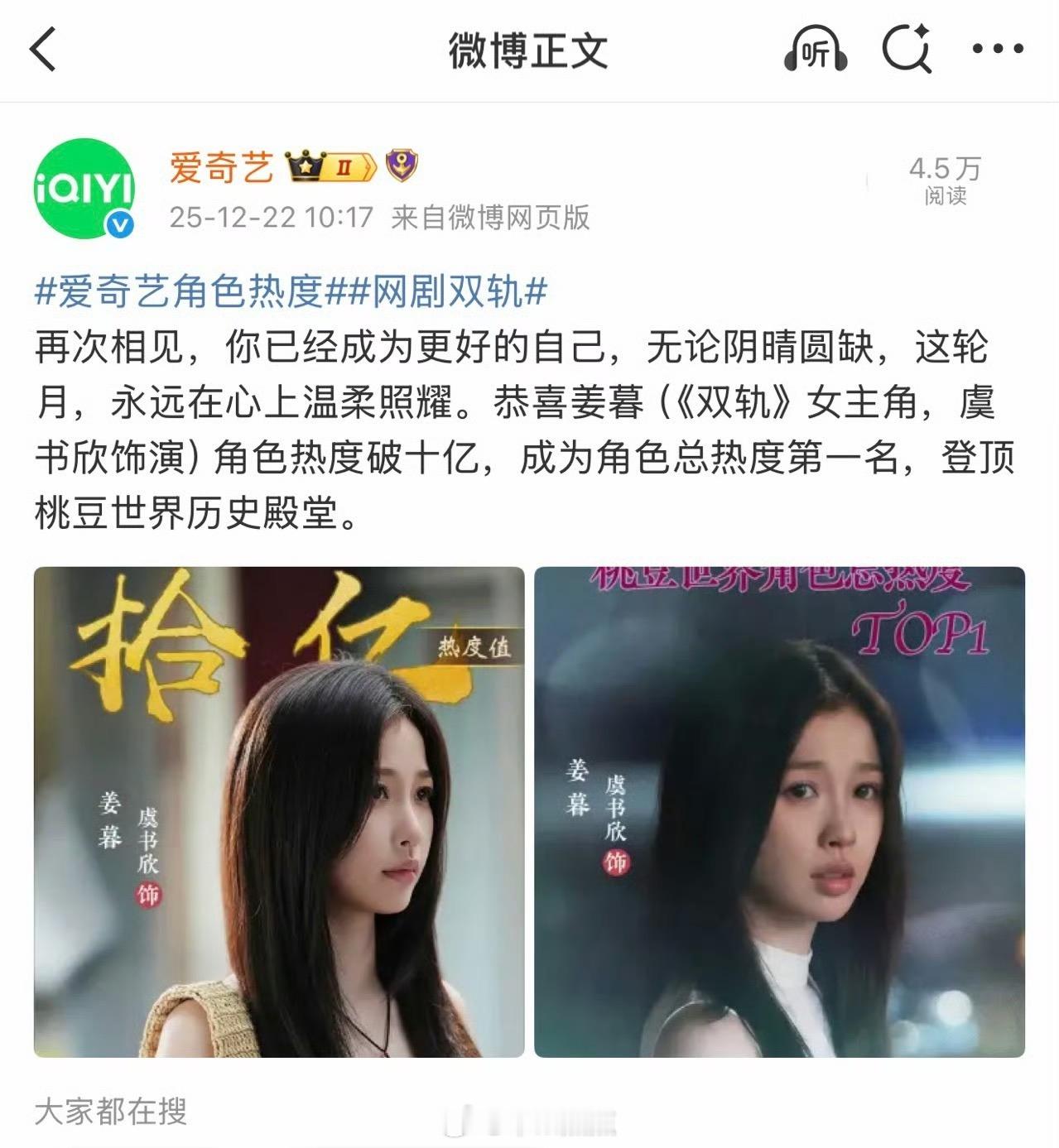 虞书欣这部双轨站内热度破8500,剧超解锁钻3,角色热度站内历史top1,在现偶