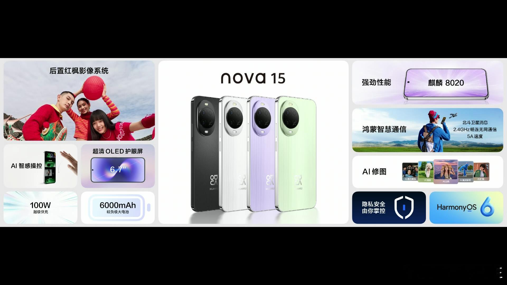 华为 nova 15价格:-12+256GB—2699元 -12+512GB—2999元-配色:好搭紫 带感绿 零度白 幻夜黑-性能:搭载麒麟 8020 移动处理平台-屏幕:6.7 英寸 120Hz OLED 直屏支持2160Hz 高频 PWM 调光 铝硅玻璃-影像:前置 50MP主摄后置:50MP 超感知主摄(RYYB+OIS)+12MP 直立长焦(RYYB+OIS)+红枫原色摄像头(150 万多光谱通道)-续航:6500mAh 硅碳负极电池+100W有线快充-其他:支持蓝牙 6.0 Wi-Fi 7 NFC 红外遥控 星闪 USB 2.0支持IP65 防尘防水 立体声扬声器 AI 双向通话降噪北斗卫星图片消息 侧边指纹识别 2.4GHz 畅连无网通支持AI 隔空手势 隔空传送 智感支付