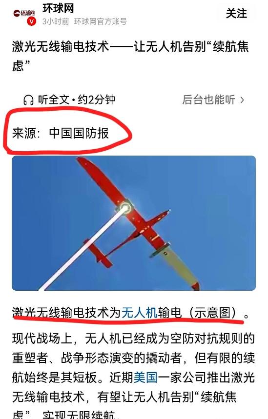 无人机,可以永不落地了!近期美国一家公司推出激光无线输电技术,有望让无人机告别“续航焦虑”,实现无限续航。目前,激光无线输电技术尚处于原型机研发阶段,但已获得美国军方的支持。 可能有人会问,激光怎么就能当电线用? 其实原理没那么玄乎,地面装个高功率激光发射器,把电能转成激光束射向空中,无人机上装个特制的接收器,就能把激光再转成电能,要么直接驱动电机,要么给电池补电。 整个过程没任何物理连线,就像在空中搭了条看不见的电线。 最让人担心的肯定是安全问题。高能激光会不会伤到人、伤到飞鸟? 这点研发团队早想到了,系统装了高灵敏度的障碍物检测模块,只要激光路径上有东西挡着,毫秒级就能自动关掉,等路径清了再重启。 而且这激光不是武器级的,能量密度刚好够发电,不会灼伤或者致盲,已经过了美国国防部相关机构的安全认证。 说句实在的,这技术对军方来说简直是刚需,以前军用无人机不管多先进,飞一会儿就得落地充电,要么靠空中加油机,麻烦又危险。 要是真能实现无限续航,侦察无人机能整天盘旋在目标上空盯梢,通信中继无人机能一直架着战场网络,作战模式都得变个样。 民用领域的潜力也不小,偏远山区铺电网成本高,用这技术给通信基站、气象站供电就很合适。 灾害救援的时候,多架无人机能靠激光持续供能,不用中途返航充电,救援效率能提一大截,当然了,它不是要淘汰电池,而是形成“激光主供+电池备份”的模式,无人机要飞出激光覆盖区,还是能靠电池飞一段。 咱们也别光唱赞歌,这技术现在还有不少坎要过,激光传输有个硬伤,必须直线传播还得看得见,云层、雨雾、浓烟都能把它挡住。 研发方说可以搞多个地面站或者用卫星、气球中继,但这方案还在概念阶段,没实际落地。 还有个容易被忽略的点,这技术不是凭空冒出来的,早在2025年7月,美国国防高级研究计划局的“POWER”计划就有过测试,在8.5公里外传输了800瓦的电能,持续了30秒,现在的技术,算是在这个基础上的升级。 对比下咱们国内的情况,目前无人机续航主要靠电池技术突破,比如固态电池、氢燃料电池。 2024年的数据显示,国内无人机电池市场里锂离子电池占了80%以上,但能量密度提升已经放缓,激光无线输电这种路线,国内还在探索阶段,和美国这次的进展有差距,但也不是没机会追赶。 大家可以琢磨琢磨,当无人机真能永不落地,会带来什么改变? 城市里的空中交通、物流配送,偏远地区的应急保障,都可能迎来革新,但同时,技术标准、空域管理这些问题也得跟上,不然乱哄哄的肯定不行。 这束来自地面的激光,不光是给无人机续上了能量,更打开了无线能源传输的新可能。 技术成熟还需要时间,不管怎么说,人类总想摆脱线缆的束缚,这一步就算是朝着目标迈进了一大步,未来能源能像光线一样自由传输,咱们的生活说不定会有更大的惊喜。
