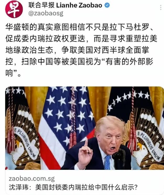 《联合早报》这挺坏?美国入侵委内瑞拉,硬要问对中国有什么启示,这不怀好意的劲隔着几千里都知道了。 国际舞台上从不缺大国博弈的图景,美国对委内瑞拉的持续施压最近再度升温。   据央视新闻报道,当地时间12月21日,美方在委内瑞拉附近国际水域拦截第三艘油轮并登船检查,此前已分别在10日、20日两次扣押相关油轮。   连月来,美国以打击“毒品恐怖主义”为由,在委内瑞拉附近加勒比海域部署十几艘军舰和逾1.5万兵力,迄今已击沉近30艘美方所谓“贩毒船”,致死逾百人,特朗普多次威胁对委境内“毒贩”发起打击。   不过美国缉毒署报告显示,委内瑞拉并非美国主要毒品来源地,但美方也未披露攻击目标涉毒的证据,委方则多次指责美方意图通过军事威胁策动政权更迭、推行拉美军事扩张,谴责拦截油轮是“严重的海盗行为”。   欲厘清美国与委内瑞拉之间的复杂纠葛,关键在于洞察美方的真实诉求。唯有如此,方能抽丝剥茧,明晰二者关系背后的深层逻辑。   特朗普政府时期,就将委内瑞拉这一反美政权视为巩固西半球主导权的重要目标,通过持续经济封锁等手段施压,本质上是靠武力震慑周边国家、遏制左翼势力扩张,而非所谓的“战略收缩”。   但委内瑞拉并未被压垮,这背后离不开包括俄罗斯在内的国际社会支持,俄罗斯在这一问题上的立场十分明确。   据新华网消息,12月18日,俄外交部发表声明,期望特朗普政府在委内瑞拉问题上勿“铸下致命大错”,以免给整个西半球招致难以预估的后果。   声明强调俄方倡导美委对话正常化,支持马杜罗政府维护国家主权的行动,主张在国际法框架下寻求建设性解决方案,以实际行动为委内瑞拉站台撑腰。   中国和委内瑞拉在石油领域有着深度合作,从油田开采到基础设施建设,再到石油贸易,合作已渗透多个层面。   美国实施的封锁举措,不仅对委内瑞拉的经济造成了强烈冲击,使其经济发展陷入困境,也在一定程度上对中国与之开展的相关合作产生了负面影响。   从国际交往的现实逻辑来看,委内瑞拉的局势演变终究绕不开中国。   多年来双方建立的合作基础深厚,无论未来局势如何变化,要实现国家正常运转、推动经济复苏,与中国的合作都是重要选项。   2023年竞选时,阿根廷总统米莱曾发表涉华不当言论。上台执政后,面对阿根廷经济发展的现实需求,他展现出理性一面,对政策进行调整,主动深化与中国的双边经贸合作,其转变堪称典型例证。   这种转变并非偶然,而是国家利益导向下的必然选择,也印证了当前国际社会中,中国的影响力无处不在,任何国家要发展经济、改善民生,都离不开与中国的务实合作,委内瑞拉的情况亦是如此。   实际上,于大国博弈之背景下,真正需从美国干预委内瑞拉这一事件中汲取启示的,乃是众多如新加坡这般的蕞尔小国。   小国在国际舞台上生存,最该警惕的是被大国霸权逻辑裹挟,在大国博弈中站错队。   新加坡长期游走于各大国之间,试图通过平衡策略寻求发展,但国际政治的复杂性远超简单的平衡游戏,美国这种动辄封锁、动用武力的做法,对所有小国而言都是潜在风险。   这一事件也给所有国家提了醒:霸权主义从来不会带来真正的和平与稳定,国际社会需要的是平等相待、互利共赢的合作关系,而非弱肉强食的丛林法则。 国际格局的演变非一蹴而就,大国应有大国担当,尊重各国主权和领土完整;小国也需具备生存智慧,坚守独立自主的外交立场。   唯有各国都摒弃零和博弈思维,通过对话协商解决分歧,才能真正实现世界的和平与发展,这才是美国干预委内瑞拉事件背后,最值得所有国家深思的核心道理。 大家对此有什么看法呢?欢迎各位在评论区留言!