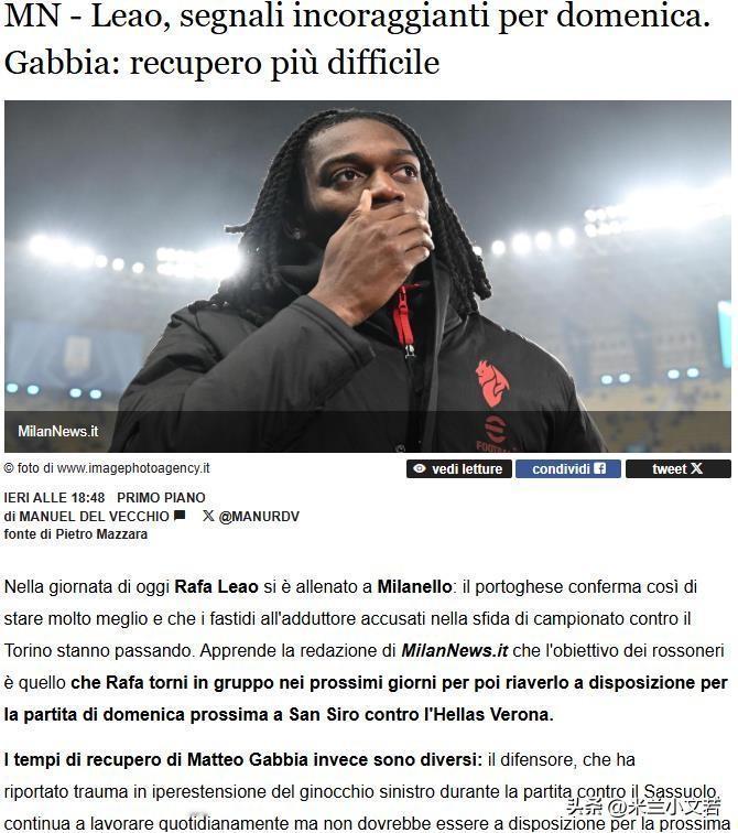 米兰现在的伤病情况!莱奥恢复的十分理想,他很可能会在未来几天完成与球队的合练,莱奥此前的身体不适感正在逐渐消退。红黑军团的目标是希望莱奥在接下来的几天内回归球队合练,并能在对阵维罗纳的比赛中出场。 然而,加比亚的恢复时间有所不同,之前与萨索洛之战加比亚遭遇左膝过度伸展的伤情,核磁共振确认的,不是米兰队医诊断的,但本应该几天就能恢复的问题,一直没有恢复的迹象,虽然加比亚参加了部分训练,但他的膝盖依然有疼痛和红肿,虽然临床影像学检查排除了关节囊韧带和半月板的损伤,但这位中卫不会急于恢复,他只有在完全准备好时才回归。加比亚不在,各支球队就可以盯着冬天哥和两个中卫的肋部打,那空挡一抓一个准,迪亚哥席尔瓦只要50万欧元,这50万欧元是弗拉尼会计的命,就是不愿意给。 希门尼斯手术十分顺利,他会在瑞士休息几天,很可能在下周回到米兰,然后开启部分训练,主要是上肢训练。