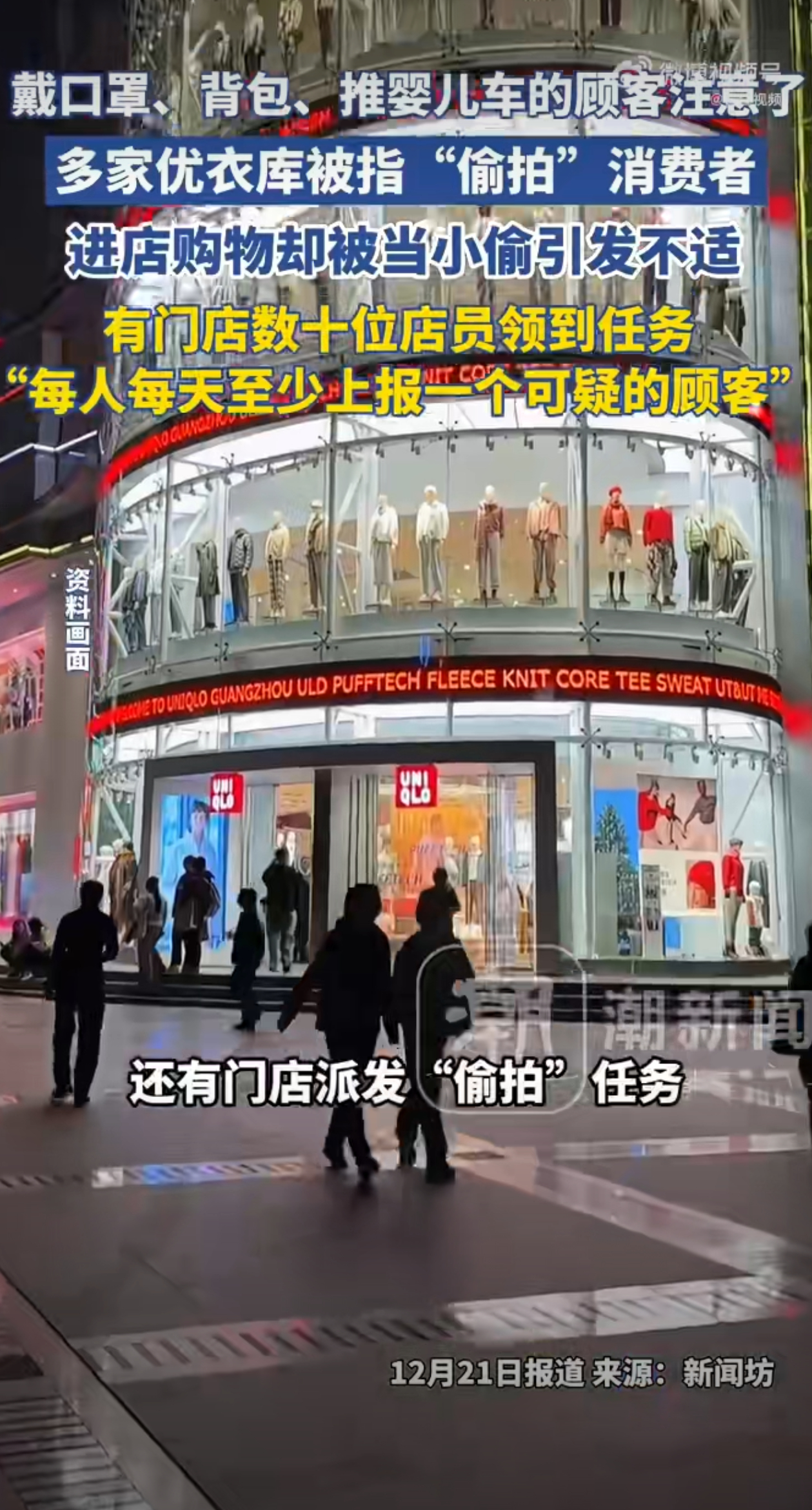 优衣库部分门店的回应显然坐实了其偷拍顾客的情况。像优衣库这种大型零售企业面临货损压力实施一定的安全防范无可厚非,但是私下给所谓的可疑顾客取专门的代号(“11号”),在企业内部群共享偷拍的顾客照片、下达员工的每日“偷拍”指标,甚至将此纳入考核等种种操作显然触及消费者隐私保护底线与商业伦理边界。因为背包、戴口罩或者推婴儿车这种情况,就被优衣库私下打上了“嫌疑人”的标签,员工偷拍的顾客照片在内部群里流通,没有明确的使用规范或者销毁机制,是否会被用于不法情况牟利不得而知,是否会对顾客的生活造成影响更是不得而知。优衣库的理念号称“最大限度的考虑并分析顾客需求,实现最高水准的顾客服务”“为所有员工提供愉快轻松的工作环境……”,为顾客贴嫌疑人标签,给员工下达偷拍指标,优衣库就是这样实现自己理念的热点观点优衣库回应门店下达偷拍顾客指标