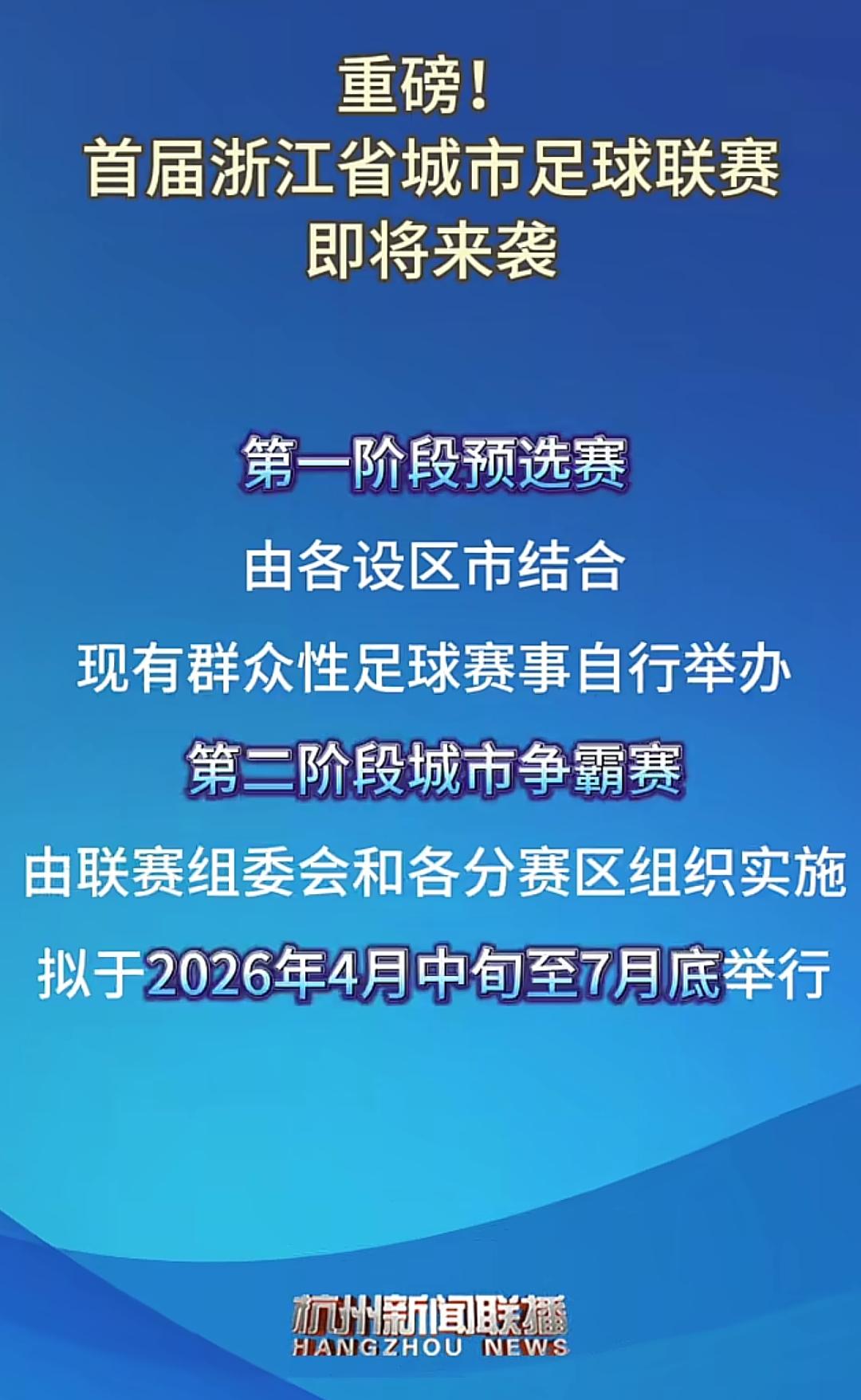 “浙超”也要来了,在苏超、赣超、湘超陆续火爆之后,浙江也将跟进举办“浙超”。 其实2025年举办城市足球联赛的省份有很多,包括江苏、江西、内蒙古、湖南、重庆、四川、云南,但真正举办得比较成功的还是少数,大概只有江苏的“苏超”、江西的“赣超”和湖南的“湘超”三个省的城市足球联赛火了。 “苏超”作为第一个吃螃蟹的,得益于众多江苏的自媒体博主自发传播,后续江苏官方媒体也全力投入,这种政府积极推动、民间热情参与的模式,让“苏超”获得了五六百亿次的流量热度,特别是像常州就创造了两三百亿的流量曝光度,极大的提升了常州市的知名度。 值得注意的是,浙江要在明年举办的“浙超”联赛赛事与其他省份的城市超级联赛赛制不一样,“浙超”是参考今年浙江火爆的“浙BA”赛制,先是每个地级市举办以区县为组队单位的球队,在城市内部先进行预选赛,最后胜出的区县队再参加全省的争霸赛。 这个模式有利有弊,一方面是可以让更多的草根球员参加比赛,但另一方面是球队的水平和观赏性可能没有以地级市组队那么高,因为区县可选的高水平球员太少。 2026年正好是有世界杯的,足球注定会成为2026年最热门的话题,相信2026年全国还会有更多的省份举办城市足球联赛,例如东北地区已经在筹备首届黑龙江、吉林、辽宁、内蒙古四地的足球联赛。