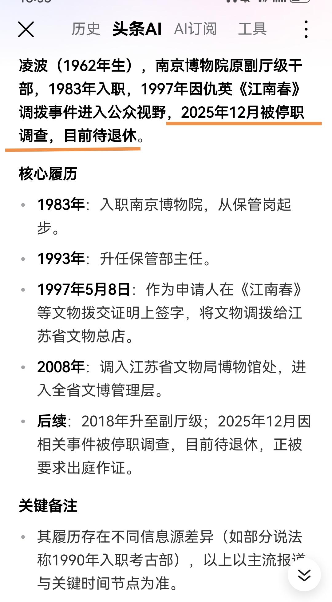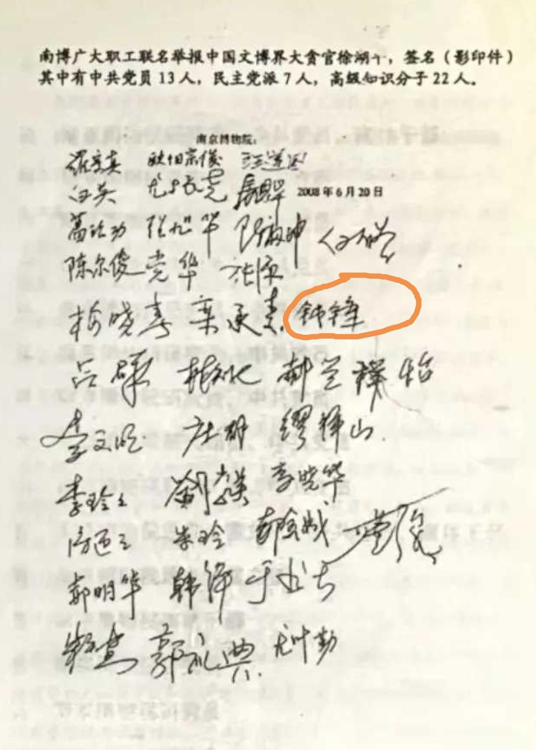 今天看到南京博物院退休职工郭礼典再次公开举报前院长徐湖平的视频,指控徐湖平利用职务之便大规模盗窃、走私故宫南迁国宝文物。 而徐湖平在这次南京博物院“消失”画作事件中,被网友们发现他就是当年在博物院移交“划拨单”院长签字栏上的“徐湖平”,当时徐湖平还不是院长,是常务副院长主持工作负责签字,值得注意的是当时“划拨单”上还有另外两个人的名字,一个是保管部的钱锋,还有一个是凌波。 其实郭礼典对徐湖平的举报早在十年之前就有了,当时江苏省有关方面踢皮球不了了之,并没有对徐湖平进行调查。当时的联名举报是有40多个南京博物院的职工签字,其中就有在“划拨单”上签字的保管部负责人钱锋,显然他们其实都是当时的知情人,应该是实在看不下去徐湖平的作为,所以才联名举报。 如今南京博物院因为庞莱臣家族捐赠明代仇英《江南春》现身拍卖市场而成为舆论焦点,我觉得正好也是可以把南京博物院过去那些蝇营狗苟的事情给揭开来的机会,就看江苏方面有没有那个魄力。