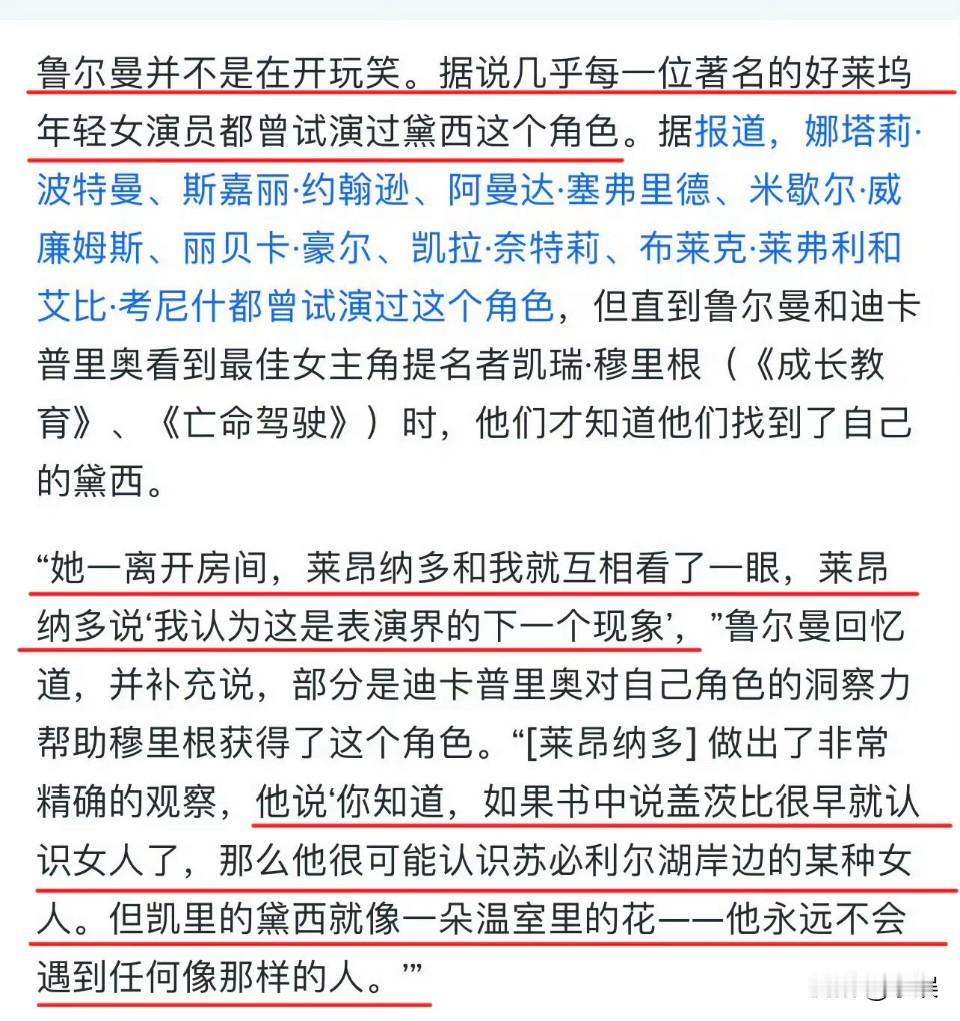 “整个好莱坞的一线女星都去试镜过黛西角色” 几乎整个好莱坞的一线女星都去试镜了《了不起的盖茨比》的黛西角色,但莱昂纳多选中了英国女演员凯瑞穆里根。 图2图3记录了当时小李子在试镜中选中凯瑞的过程和原因,因为觉得她是“温室中的花朵”。 被小李子选为女主后,凯瑞穆里根因为《了不起的盖茨比》一炮而红。剧组在戛纳首映的雨中神图也惊艳了很多人。好莱坞女星 凯瑞穆里根