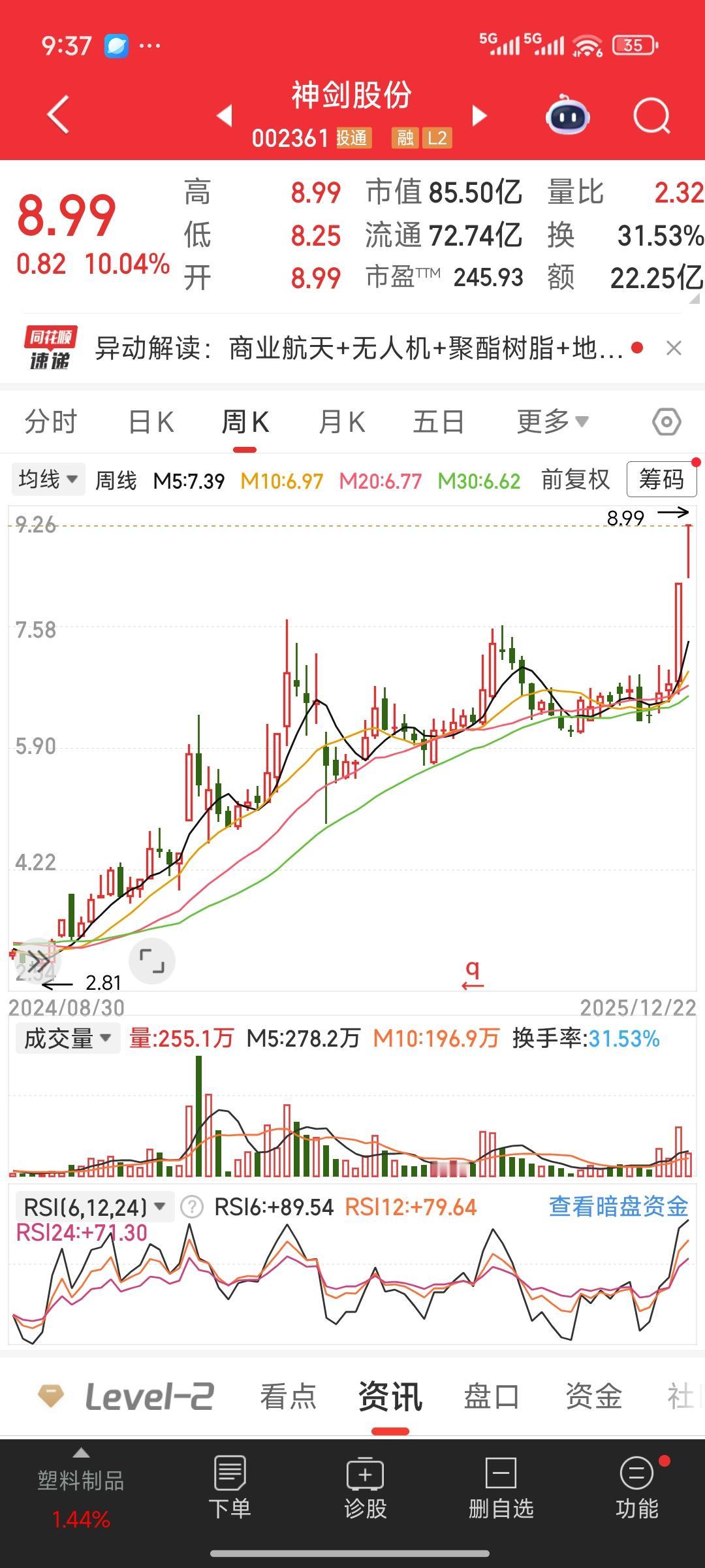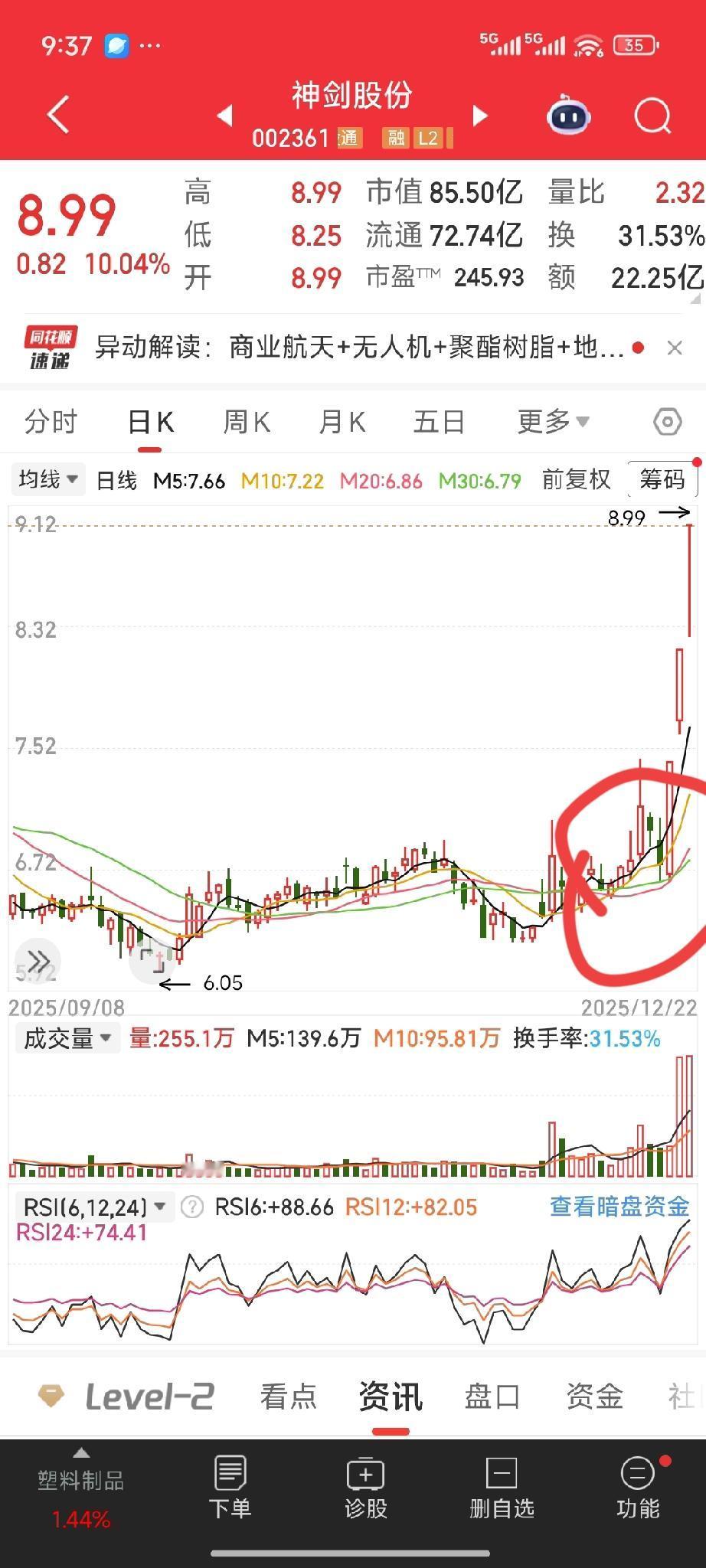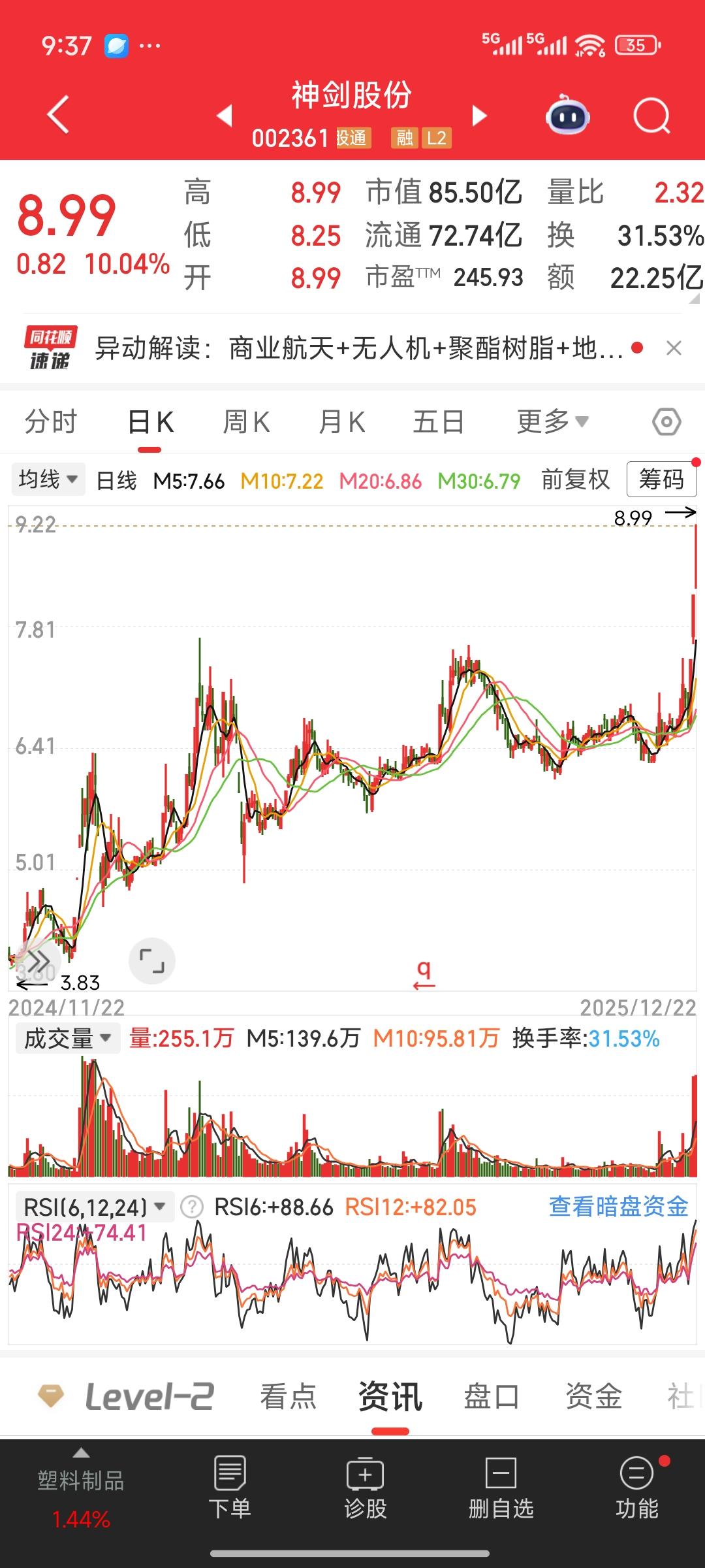 发现一只连涨且涨停的股票——神剑股份。它已经连续三个涨停,近两日还都呈现放量态势,连续两天放量涨停,真无愧于“神剑股份”这个霸气的名字。 我们可以看到,在这三个连续涨停之前,它有过小幅拉升,接着连续两天出现“下蹲”动作,就像是起飞前的蓄力,也可看作是一个颇为标准的小n型走势。 可惜又错过了,股友们,你们有抓住这只股票吗?妖股板块 连板股票 妖股地天板 连板股 坚朗精密股票 低价业绩股 地天板股票