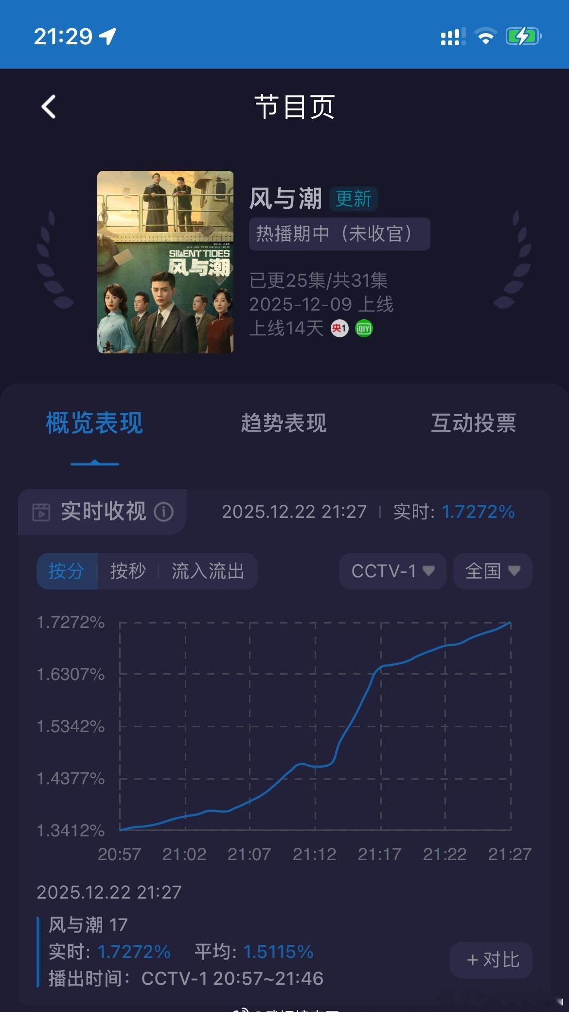 今天风与潮单更,20.57分钟播出一集,酷云收视率直接起飞,从1.3拉升到1.7272,央视一台观众对风与潮已经形成很强粘性了!电视剧风与潮