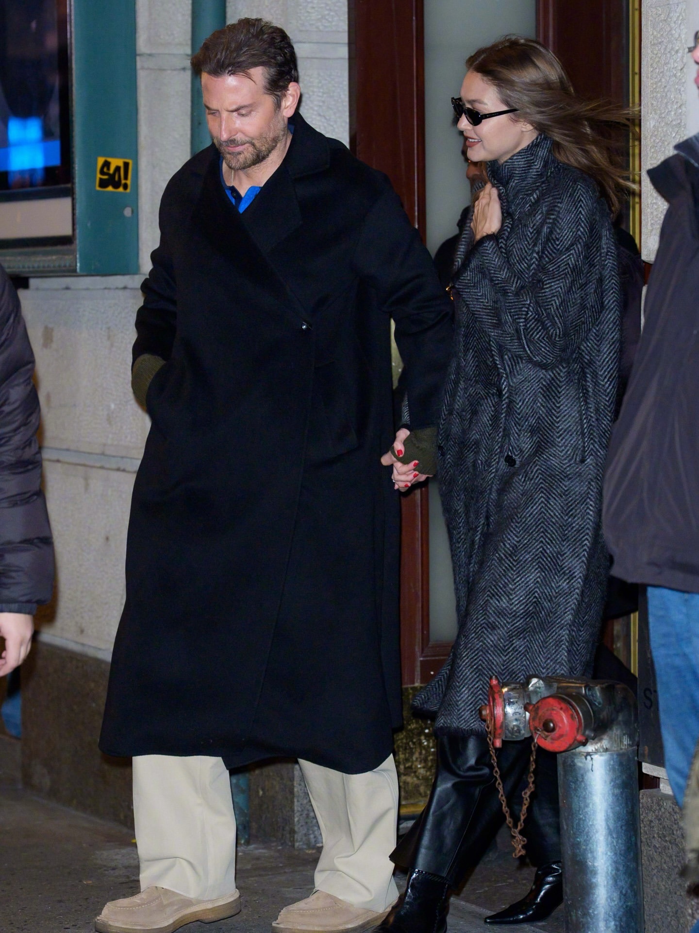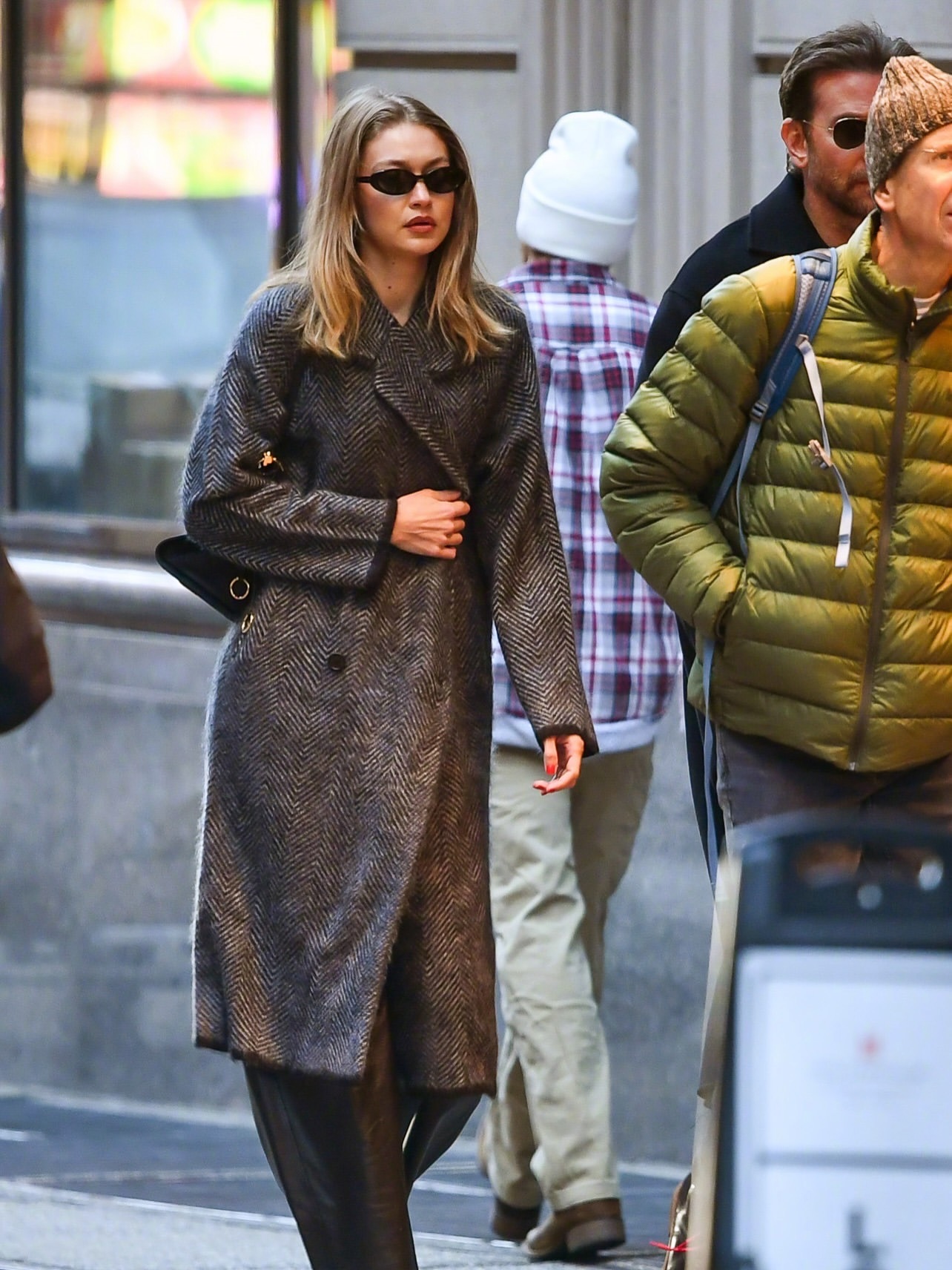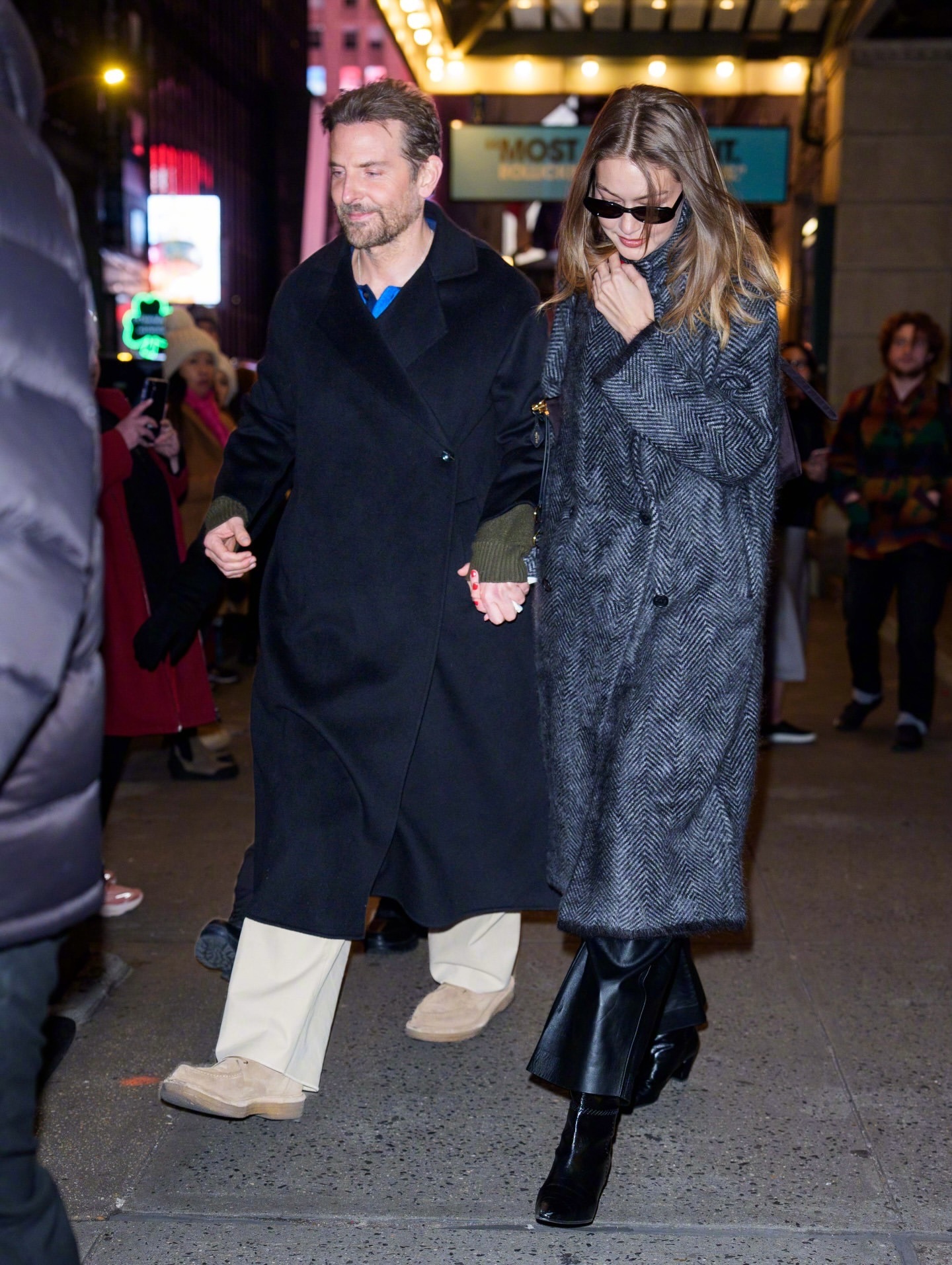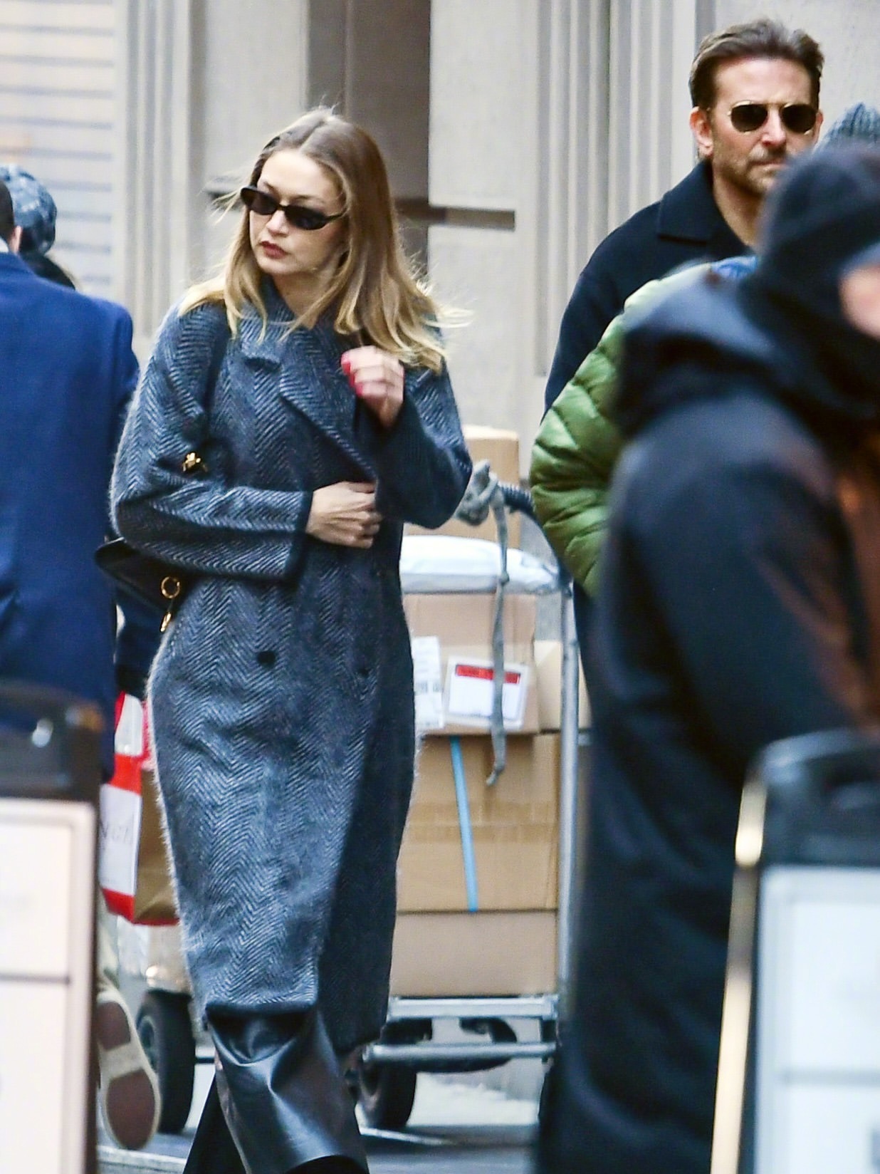Gigi Hadid和男友布莱德利·库珀在纽约离开百老汇话剧《等待戈多》的演出现场被拍。Gigi这头发终于长长了。身穿的还是自己品牌的大衣!米拉服饰解析