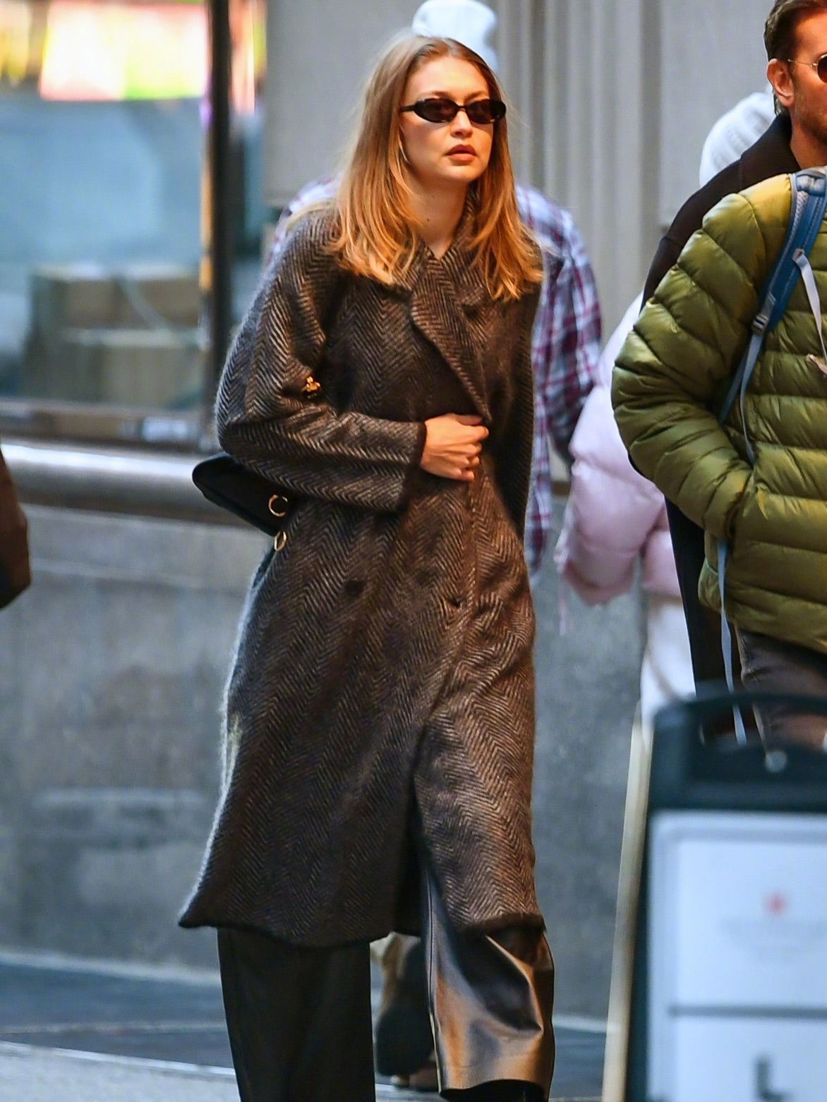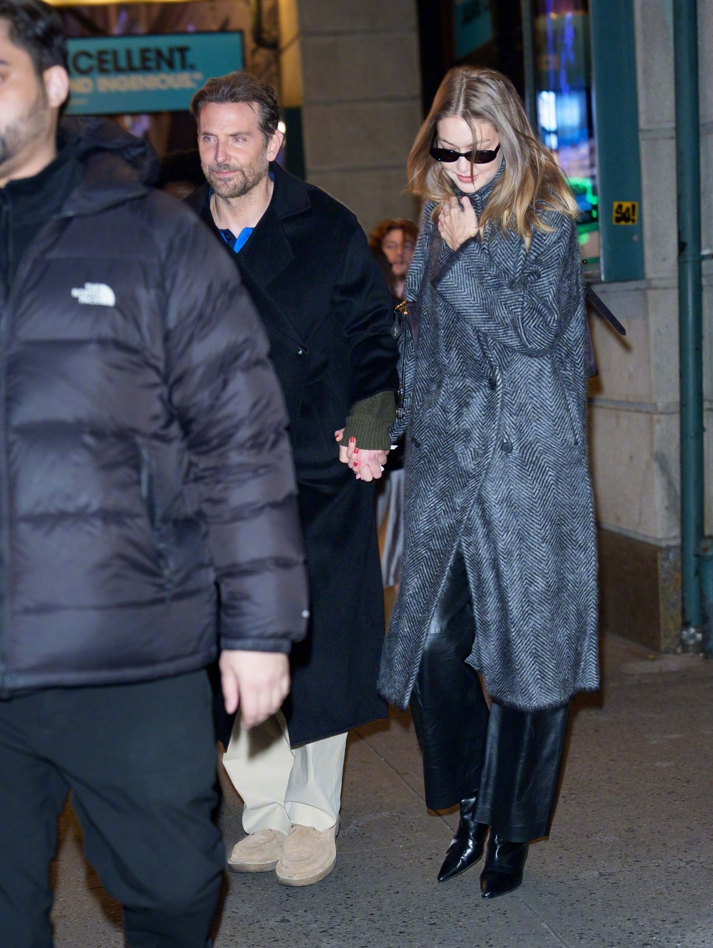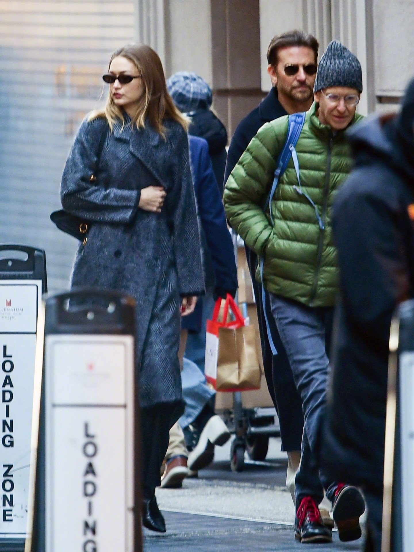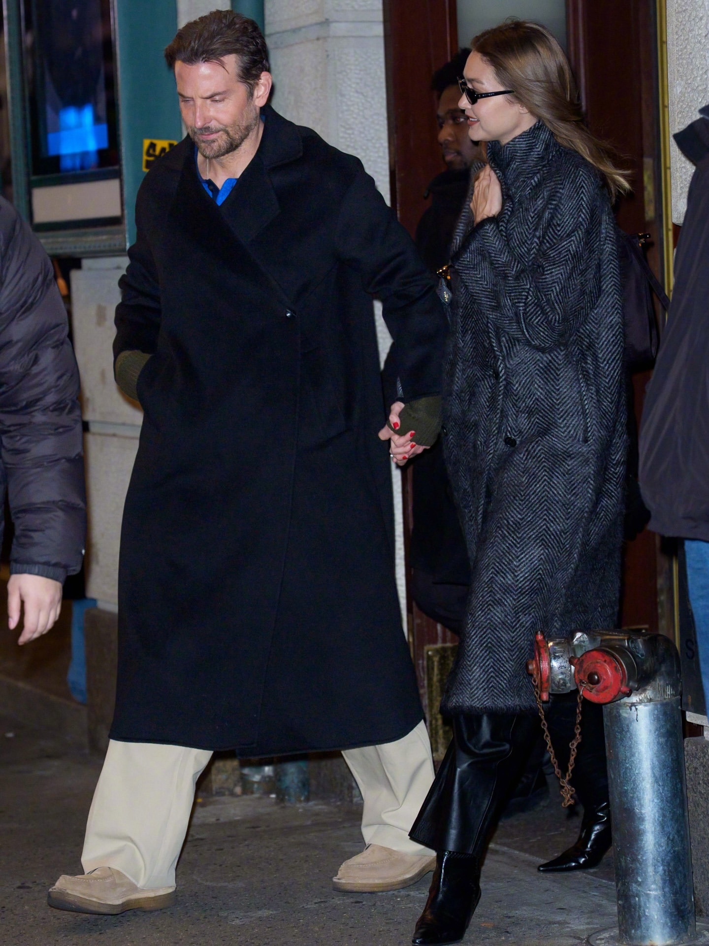 Gigi Hadid和男友布莱德利·库珀在纽约离开百老汇话剧《等待戈多》的演出现场被拍。Gigi这头发终于长长了。身穿的还是自己品牌的大衣!米拉服饰解析