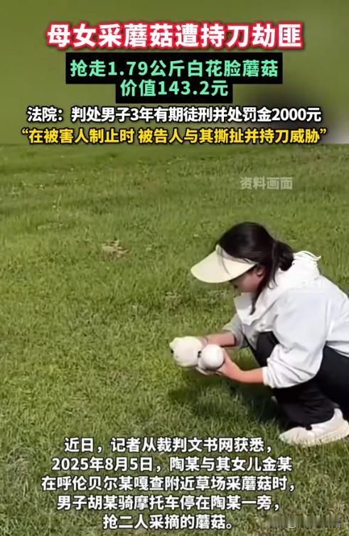 内蒙古呼伦贝尔,一女子带着女儿去野外采了1.79公斤的白花脸蘑菇,价值143.2元,没想到被同村男子给截胡了。女子报警后,警方认定男子的行为构成抢劫罪,法院更是判了男子3年有期徒刑,罚金2000元。网友:抢个蘑菇处罚这么重?(来源:西安晚报) 据悉,2025年8月5日下午1时许,陶女士带着10岁的女儿在呼伦贝尔某嘎查附近的草场采白花脸蘑菇,这是他们平时的口粮。经过一段时间的采摘,小筐里的蘑菇越来越多。 突然,远处传来一阵摩托车的轰鸣声,母女俩个循声望去,发现是男子胡某骑着摩托车向他们这边驶来了。随后,胡某把车停在了母女面前。 陶女士当时有点害怕,因为她不知道胡某要做什么,而且女儿还在身边,她担心胡某会对女儿不利。 可胡某下车后,并没有对母女俩怎么样,而是把伸手抓住陶女士搭在胳臂上的蘑菇筐,想要抢走。 陶女士哪里肯放手,毕竟这是她和女儿俩辛苦采摘的。可胡某见陶女士不肯交出蘑菇,竟然直接掏出了一把折叠刀,刀刃对着陶女士的胸口。胡某威胁陶女士,要求其交出蘑菇。 见胡某的目标只有蘑菇,陶女士为了自己和女儿的安全,于是就把蘑菇给了对方。 胡某连筐和筐里的蘑菇一并带走,骑上摩托车一溜烟的功夫就不见了。 陶女士见胡直远去的身影,立即拿出手机报了警。 后警方在胡某家中找到了那把刀和那筐蘑菇,经过定价,这筐蘑菇的总价值才143.2元。 警方认为,胡某持刀抢了陶女士的一筐蘑菇,虽然金额不大,但该行为仍构成抢劫罪。 《刑法》第263条规定,以暴力、胁迫或者其他方法抢劫公私财物的,处3年以上10年以下有期徒刑,并处罚金。 法院经审理后认为,胡某的行为构成抢劫罪,且因胡某有犯罪前科,系累犯,故应当从重处罚,故判决胡某有期徒刑3年,罚金2000元。 有人认为,不就是100多元的蘑菇吗?至于判3年有期徒刑? 其实,刑法中的抢劫罪并不是以犯罪金额来定罪的。如诈骗罪、盗窃罪、故意毁坏财物罪等,这些罪名都需要达到数额较大的标准,才能立案追诉。 但是抢劫罪不同,抢劫的金额只是一个量刑的标准,并非定罪的标准。对于抢劫罪来说,只要行为人实施了暴力抢劫的行为,即可认定为犯罪。 也就是说,哪怕胡某就抢了陶女士1元钱,那也是构成犯罪的。 本案中,胡某持刀威胁陶女士母女二人交出蘑菇的行为,侵犯了陶女士母女二人的人身安全和财产安全,所以符合抢劫罪的构成要件。 在警方调查过程中,发现胡某在2024年2月因危险驾驶罪被判拘役2个月20天,当年4月才刑满释放。这刚出狱4个月,就又犯了抢劫罪,符合累犯的构成条件。 《刑法》第65条规定,被判处有期徒刑以上刑罚的犯罪分子,刑罚执行完毕或者赦免以后,在五年以内再犯应当判处有期徒刑以上刑罚之罪的,是累犯,应当从重处罚。 因此,虽然胡某才抢劫了价值143.2元的蘑菇,但他的人身危险性比较大,如果不严惩不足以体现法律的公平公正。 有人说,如果胡某不拿刀,他的行为该如何定性? 如果不拿刀的话,胡某的行为很可能被定性为抢夺。 《关于办理抢夺刑事案件适用法律若干问题的解释》第1条规定,抢夺公私财物价值1000元至3000元以上、3万元至8万元以上、20万元至40万元以上的,应当分别认定为刑法第267条规定的“数额较大”、“数额巨大”、“数额特别巨大”。 由此可见,抢夺财物的数额需要达到1000元以上。 因此, 胡某如果不拿刀去抢蘑菇,其行为并不会构成犯罪,但会受到治安管理处罚,处以5~10日拘留,可以并处500元以下罚款;情节较重的,处10~15日拘留,可以并处1000元以下罚款。