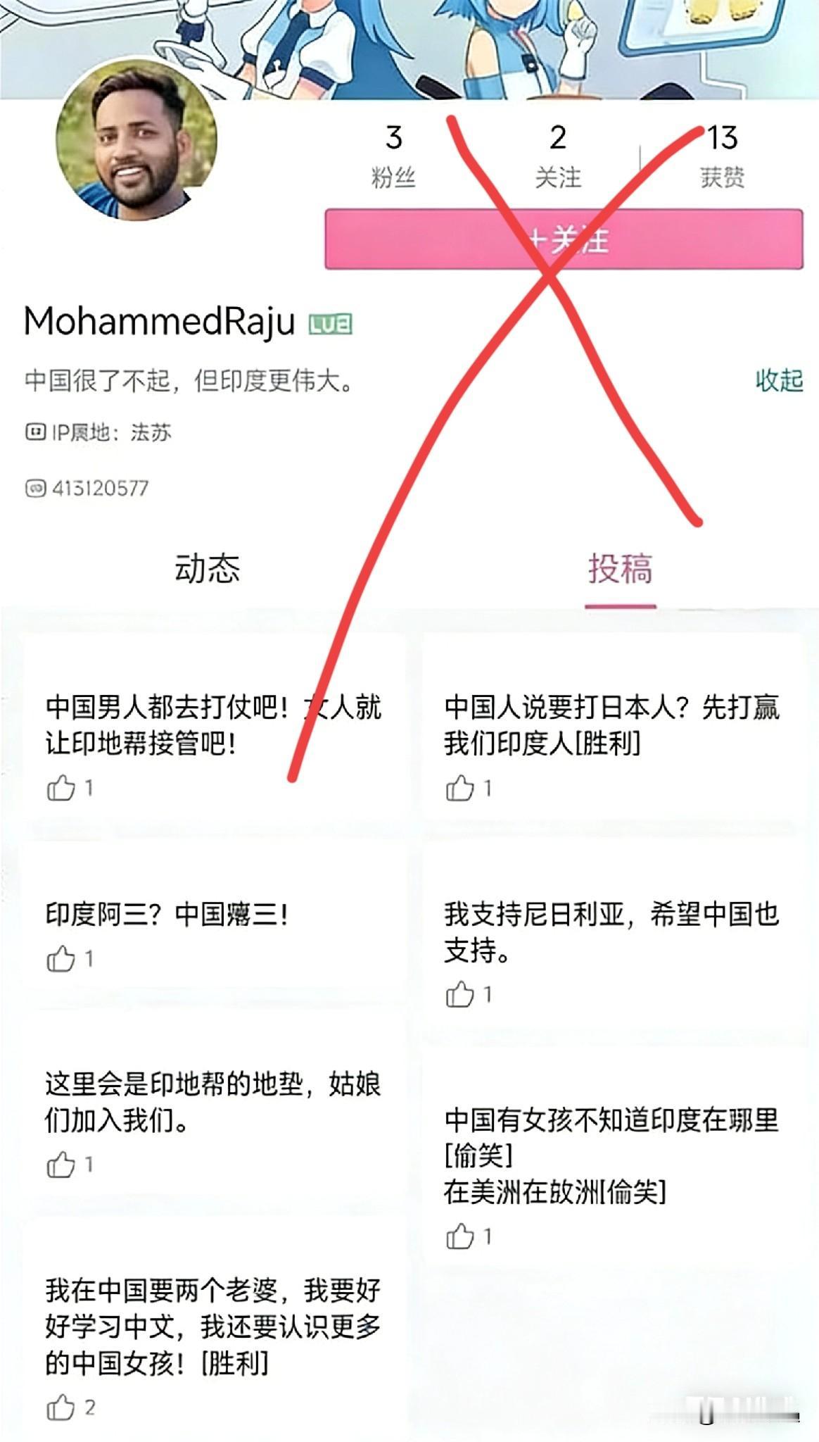 IP在江苏的印度博主,真把中国的包容当没脾气了!在B站公然辱骂中国女性,还抱着极端精日心态,甚至敢触碰侮辱烈士的红线,这哪是吐槽,分明是挑衅! 客居中国就该守中国的规矩,尊重这片土地的人民与英雄是底线。咱们的善意从来不是让外人放肆的资本,这种践踏国家尊严、触犯法律的行为,绝不能轻饶。查实之后依法严惩,才是对底线的守护! 各位读者你们怎么看?欢迎在评论区讨论。
