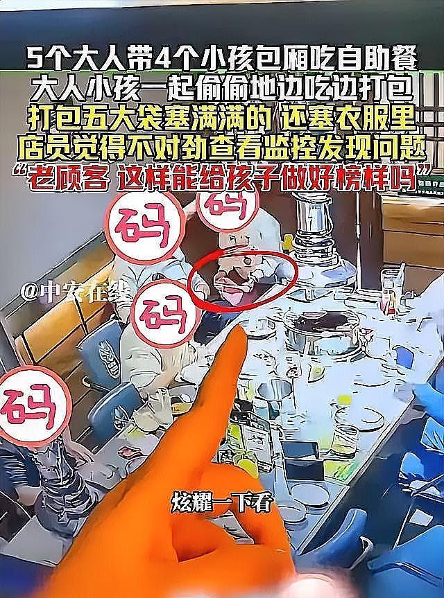 真是忍无可忍!新疆一家海鲜自助餐厅里,5个大人带着4个孩子吃饭,竟玩出了“新花样”——监控镜头下的画面让人惊呆了:41份榴莲、22份三文鱼被偷偷塞进布袋,连羽绒服都成了“打包神器”! 店员事后回忆,当时这一行人自称是常客,刚坐下就开始指挥孩子往布袋里猛塞东西。旁边的大人不仅不阻止,还伸手往羽绒服口袋里塞三文鱼,生怕少拿了似的。结账的时候,孩子的羽绒服鼓鼓囊囊的,明显不对劲。店家一清点,好家伙:榴莲拿了41份,三文鱼22份,其他菜更是每份至少10份! 大家都炸锅了:这到底是来吃自助,还是来进货的?更让人无语的是那几个孩子,明明是被大人教着破坏规则。今天偷的是海鲜,明天会不会偷更贵重的东西?餐厅老板直接报了警,说必须让这些“海鲜大盗”知道,占便宜是要付出代价的! 你觉得这种全家一起“进货”的行为,到底该怎么治?