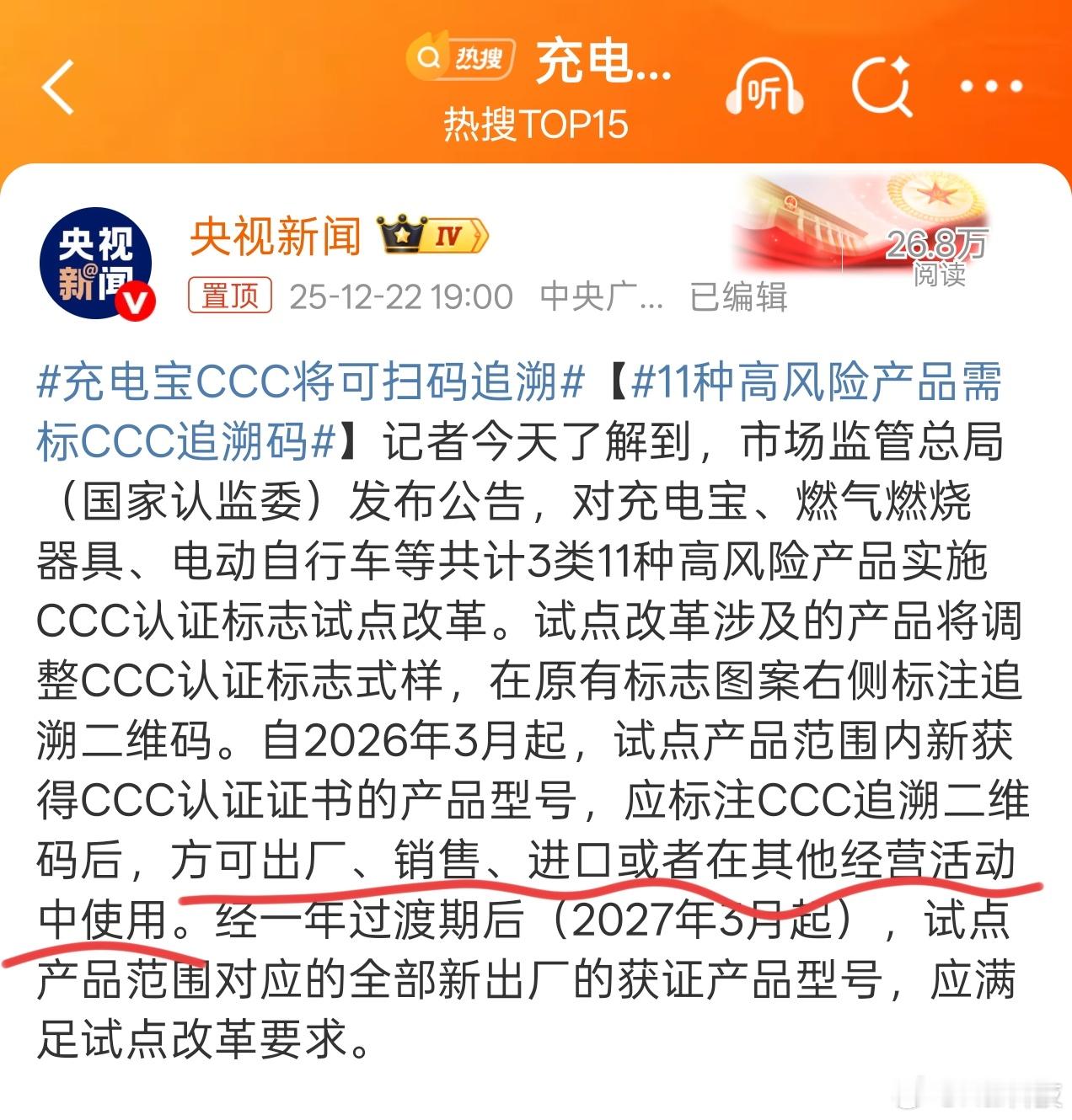 新3C可溯源倒逼制造厂商更严苛,还有一年过渡期是好事不过旧充电宝怕是只能在家里及附近用了,很难上飞机,出差又得花钱买新充电宝了~充电宝CCC将可扫码追溯