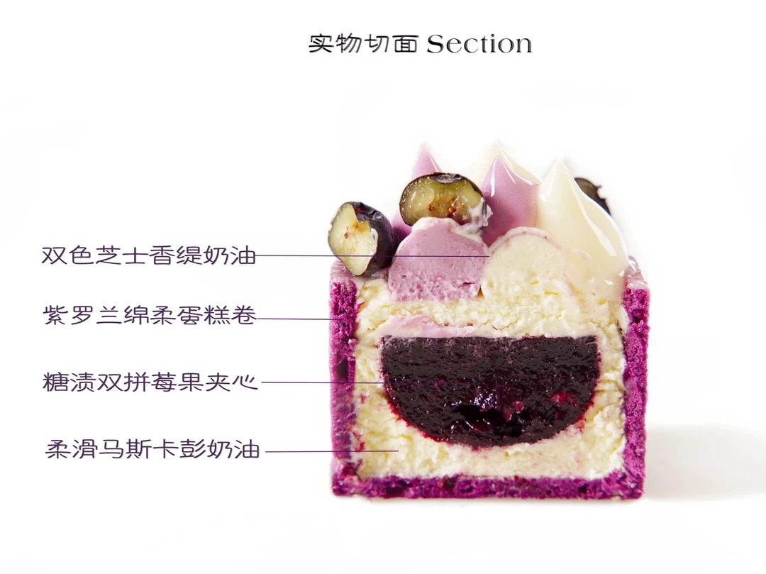 转化糖浆、柠檬汁与樱桃果茸混合加热至40°C,加入拌匀的NH果胶与砂糖,继续搅拌加热煮至沸腾加入糖渍蓝莓与樱桃,持续沸腾1分钟离火注模冷冻。