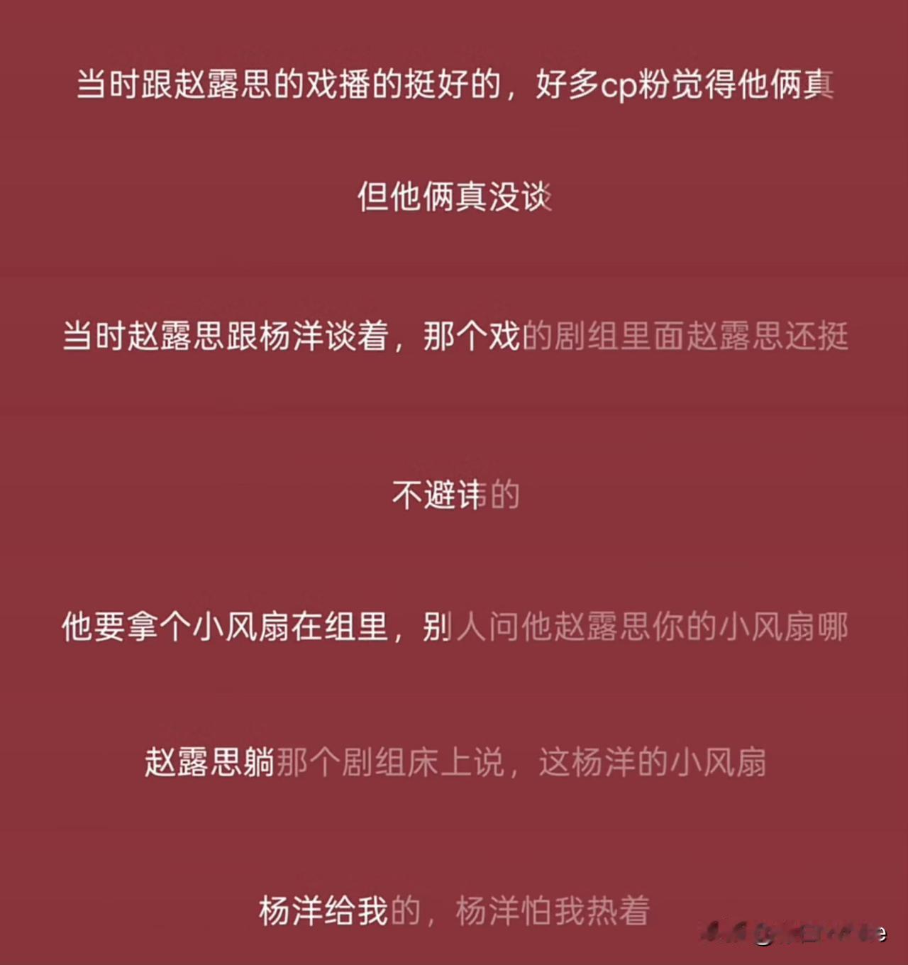 12月22日,业内在饭局上说赵露思和杨洋在一起过,拍《星汉灿烂》的时候,赵露思还在剧组毫不避讳的说杨洋给她小风扇怕她热着 我没记错的话,杨洋跟赵露思合作过《且试天下》,那部剧是2021年2月开机的! 吴磊跟赵露思《星汉灿烂》2021年7月开机,也就是在赵露思跟杨洋合作完《且试天下》后 杨洋给赵露思小风扇,怕她热,在我看来并不算是什么恋爱证据,毕竟只是个小风扇 赵露思在内娱没几个cp,绯闻男友倒是挺多 赵露思