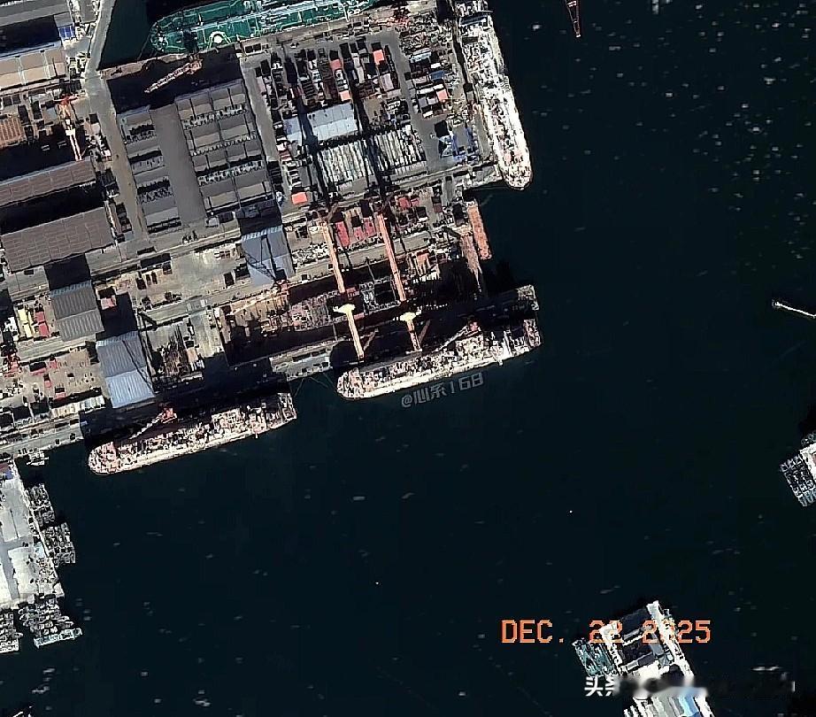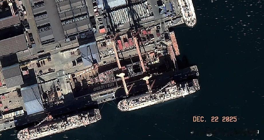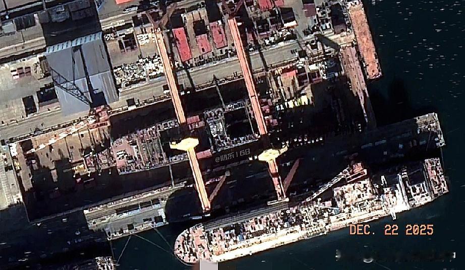 达利安干船坞冬至当天依旧是三班倒!!春节吃水饺前或完成大合拢... 景象很直观,舰艏收窄的趋势越来越明显,动力舱段前方已经向外延伸出一截,机库侧壁安装完毕,舰艉的底板模块已经就位但还没安装完毕,部分龙骨墩也清晰可见。 对比一个多月前的画面,变化堪称天翻地覆,干船坞周边堆满了各类预制分段,看这架势,马上会大干快上,毕竟重要的核心舱段完成之后,其它的外围部分以我们的制造业能力,肯定跟搭积木似的快马加鞭。 按照这个进度推算,春节前大概率能实现船体完全合拢。