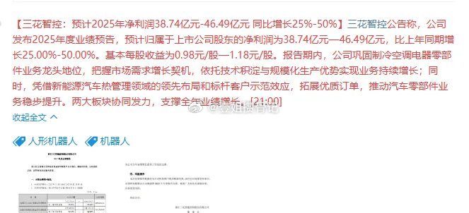 机器人龙头三花智控,预计2025年净利润38.74亿元-46.49亿元 ,同比增长25%-50%。这个业绩非常不错,今天机器人领涨,特别是午后AI科技涨不动,资金高低切轮动机器人,三花智控大涨4.49%。龙头业绩不错,对机器人板块是正向刺激。机器人一直跟着AI科技涨,被AI科技压着,就是缺乏龙头带动,龙头缺乏赚钱效应,缺乏产业逻辑的业绩高增。明天三花智控,机器人,市场关键方向之一。重点留意。