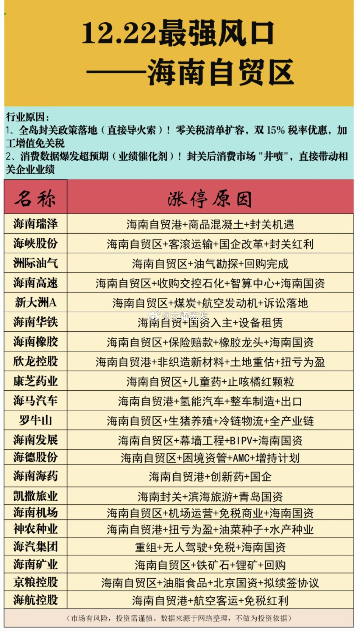 【市场聚焦】12月22日周一 核心热点:海南自贸港概念驱动逻辑主要基于以下政策与预期利好:一、“零关税”清单扩容与税收优惠:海南自贸港对鼓励类产业企业减按15%征收企业所得税,高端紧缺人才个税实际税负超15%部分予以免征。此外,“加工增值免关税”等政策持续深化,吸引产业与资本聚集。二、全岛封关预期下的消费市场潜力:随着全岛封关运作准备推进,未来海南有望形成更具竞争力的免税购物与高端消费市场,吸引消费回流,市场增长空间可期。三、基础设施持续建设:封关运作需配套的物流、交通、信息化等基础设施正在加快建设,相关基建及服务企业有望受益。板块关注方向:可重点关注免税商业、交通运输、本地基建、旅游消费等直接受益产业链。建议结合政策落地节奏与公司基本面进行跟踪。财经股票今日盘面分析