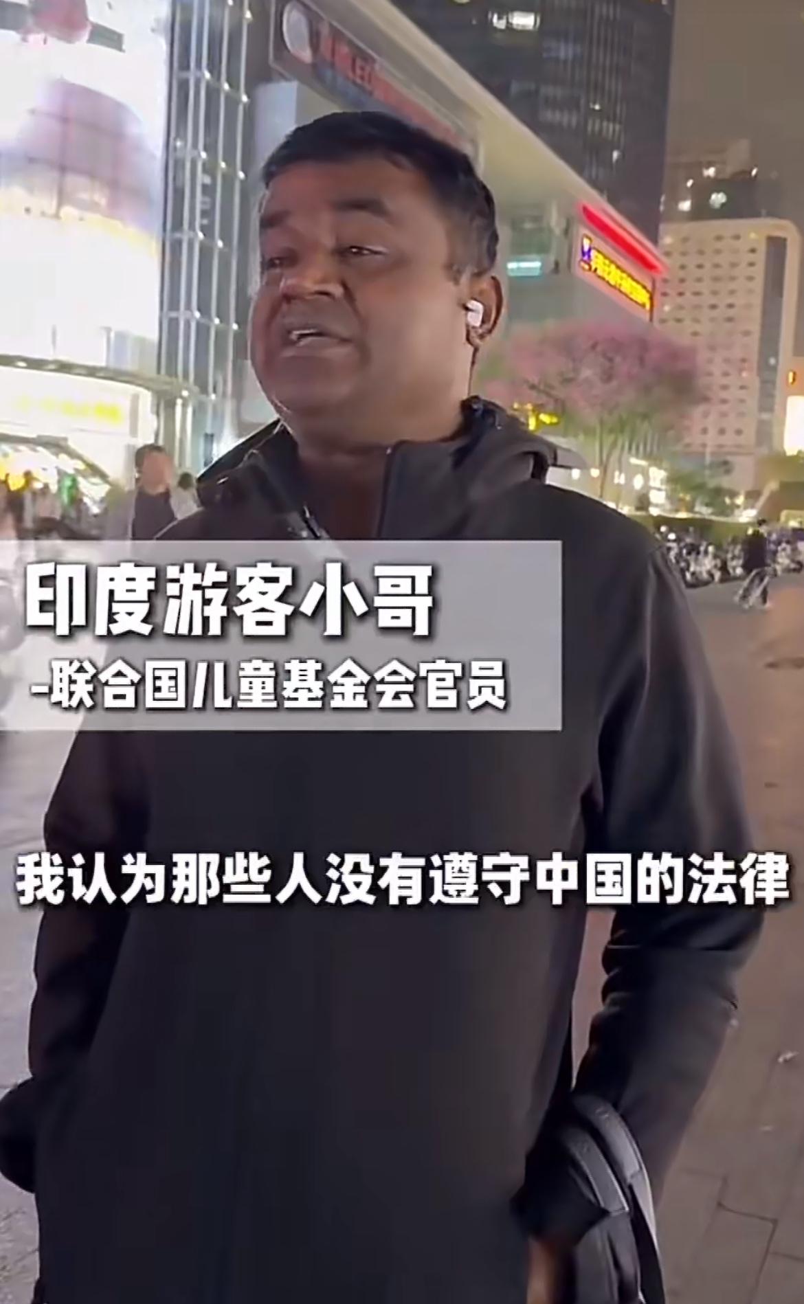 来华旅游的印度联合国官员称:那些滞留的印度人是穷人,他们不遵守任何规则,没有遵守中国的法律,他还认为大家对南亚人的区别对待不是中国人的问题,是那些不遵守规则的非法滞留的外国人,中国应该更加关心并加强移民制度