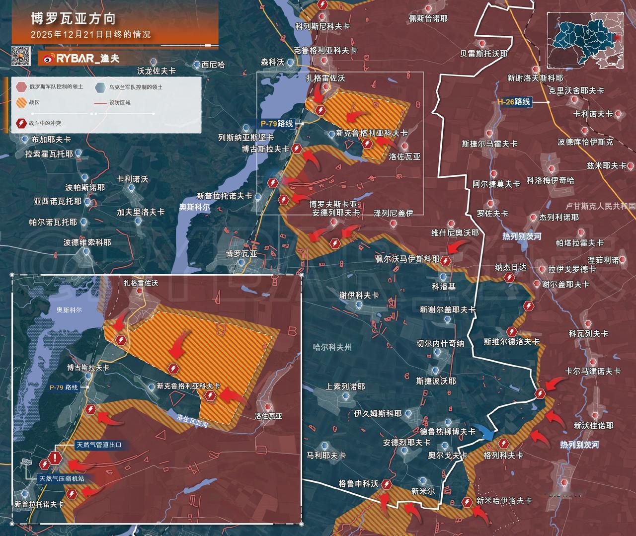 🚩博罗瓦亚方向 2025年12月21日日终的情况 尽管库皮扬斯克方向的战场局势依然复杂,但在战场南部,俄联邦武装力量正在博古斯拉夫卡地区扩大控制区域。俄罗斯"西部"集团军的部队正致力于分割乌军在奥斯科尔河左岸部署的集团军部队。 据报道,俄军突击部队发动了一系列攻击,旨在消除洛佐瓦亚与新克鲁格利亚科夫卡之间的“口袋”地带。目前双方的战斗围绕在数个大型据点展开,敌方利用无人机对这些据点的己方部队进行补给。 🔸与此同时,俄联邦武装力量也在战场南部发起进攻。不久前,新普拉托诺夫卡附近区域的一连串防御工事已转入俄军的控制下。此后,俄罗斯西部集团军的士兵开始沿着此处的天然气管道,继续向奥斯科尔河方向发起攻击,力图在天然气压缩站附近区域巩固阵地。 📌 这将使俄军能够切断乌军在奥斯科尔河左岸的交通路线,迫使敌方转而依赖重型无人机运输补给,并为博古斯拉夫卡附近的俄军部队提供补给。乌克兰部队发现了俄军的突击部队,并试图阻止俄军巩固阵地。目前该地区仍在进行激烈战斗。 俄乌冲突新局势俄军最新进展热点观点 来源:RYBAR_渔夫