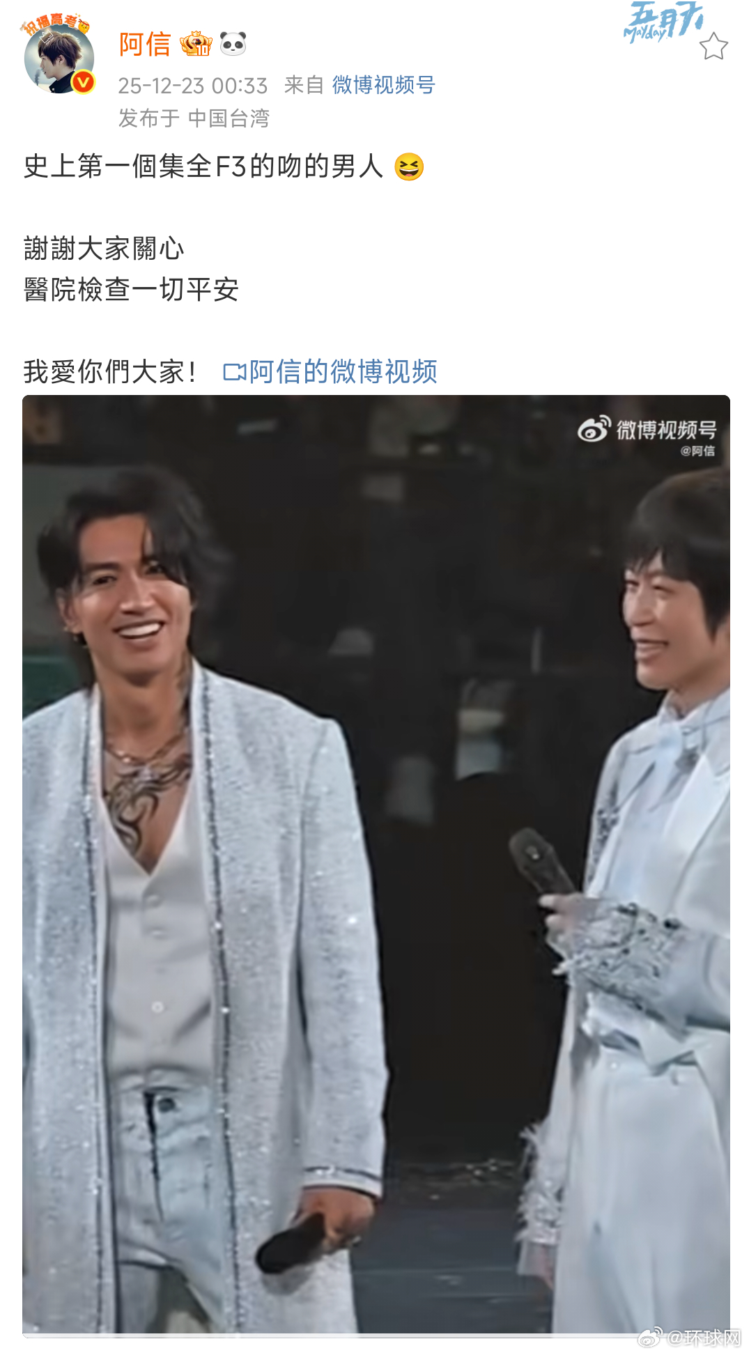 【#阿信发文报平安#】#阿信发文回应摔下舞台#12月22日,演唱会中阿信摔
