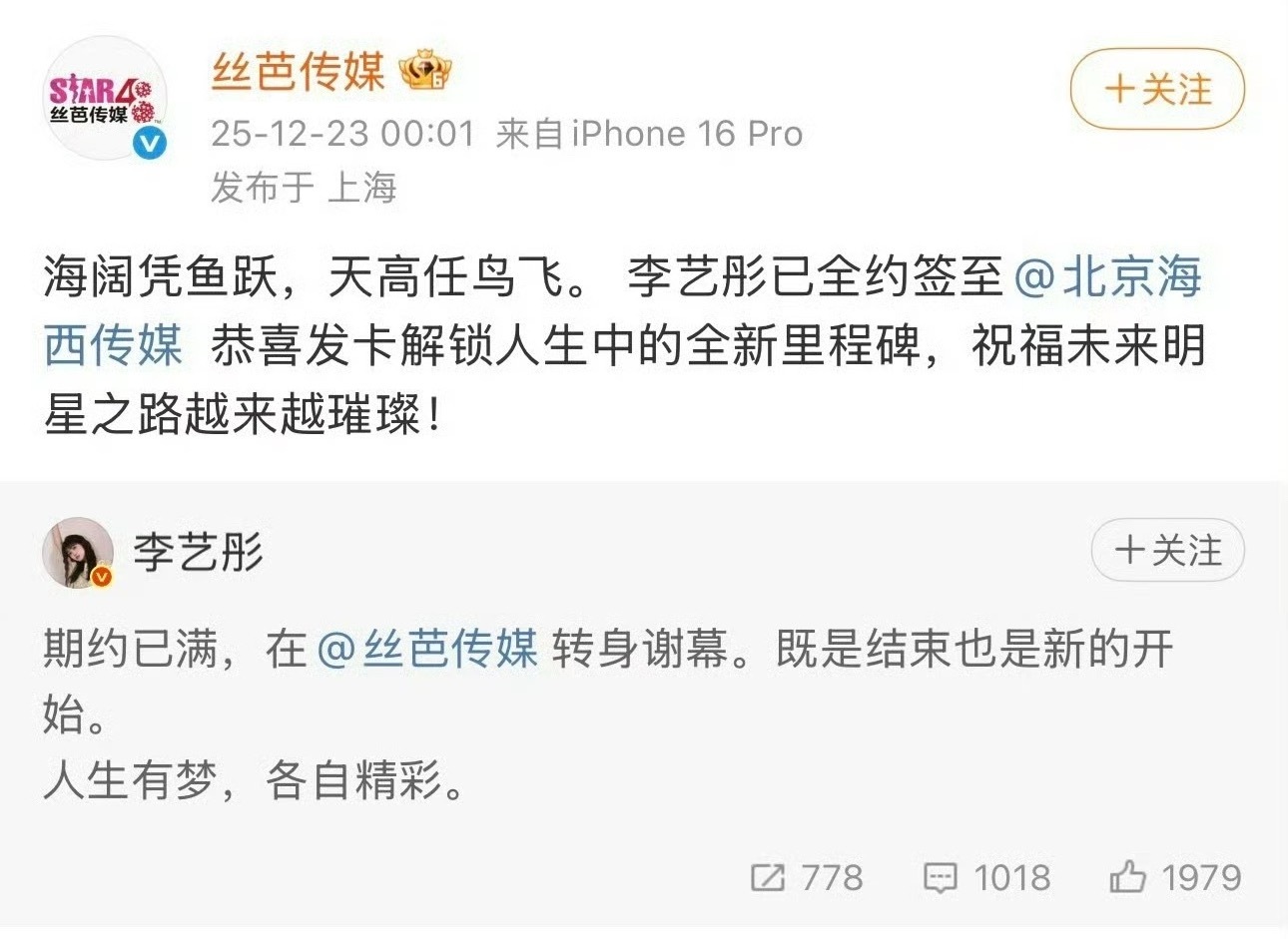 前两天丝芭和鞠婧祎还因为合约问题闹的沸沸扬扬,要想分手就得扒一层皮,结果刚刚丝芭就官宣跟李艺彤和平解约了,官号甚至还艾特了新公司。看粉丝科普的时间线应该也是赔了不少,但是这样也算很体面了,一对比更觉得丝芭对鞠婧祎是真狠啊……