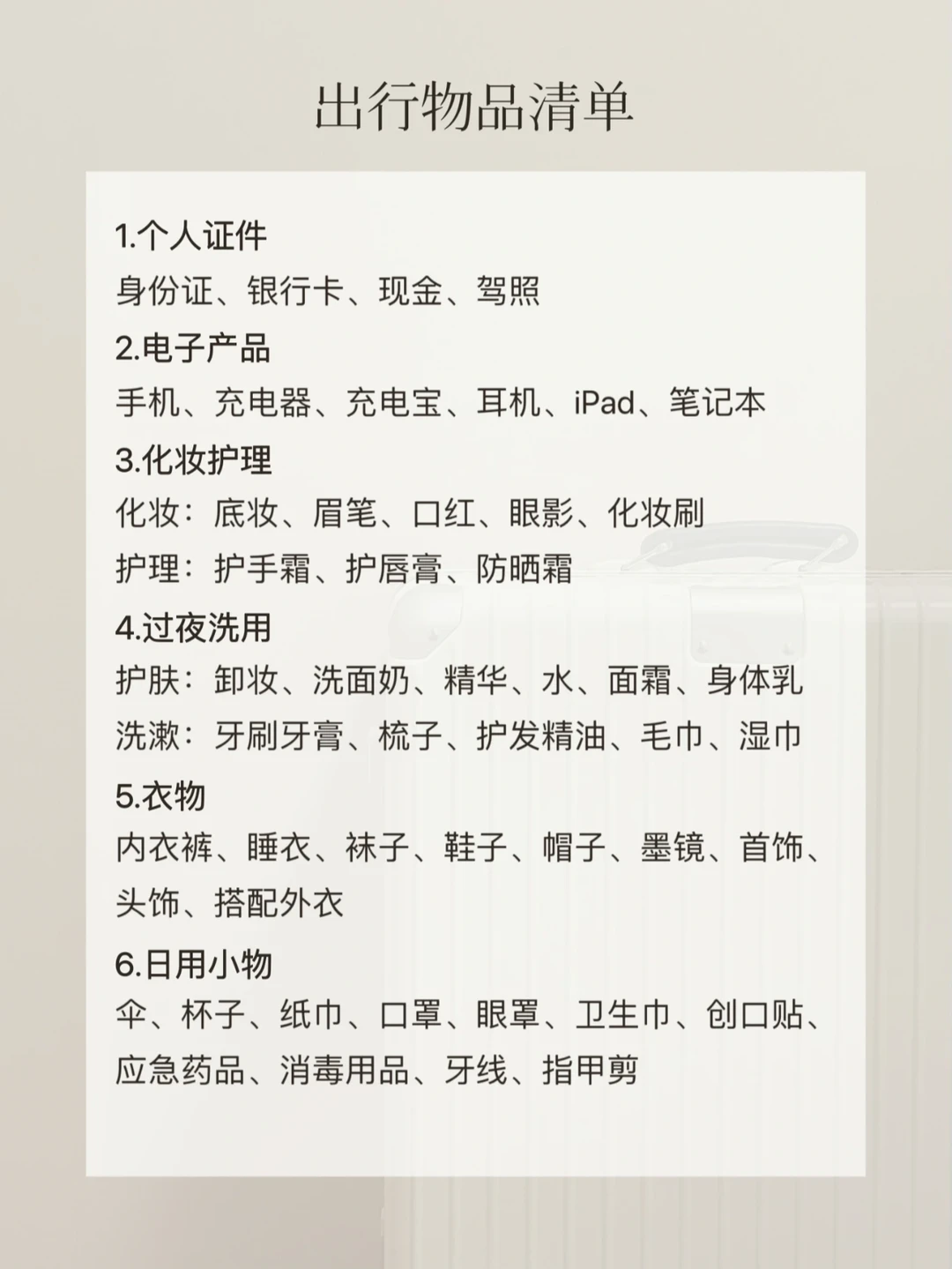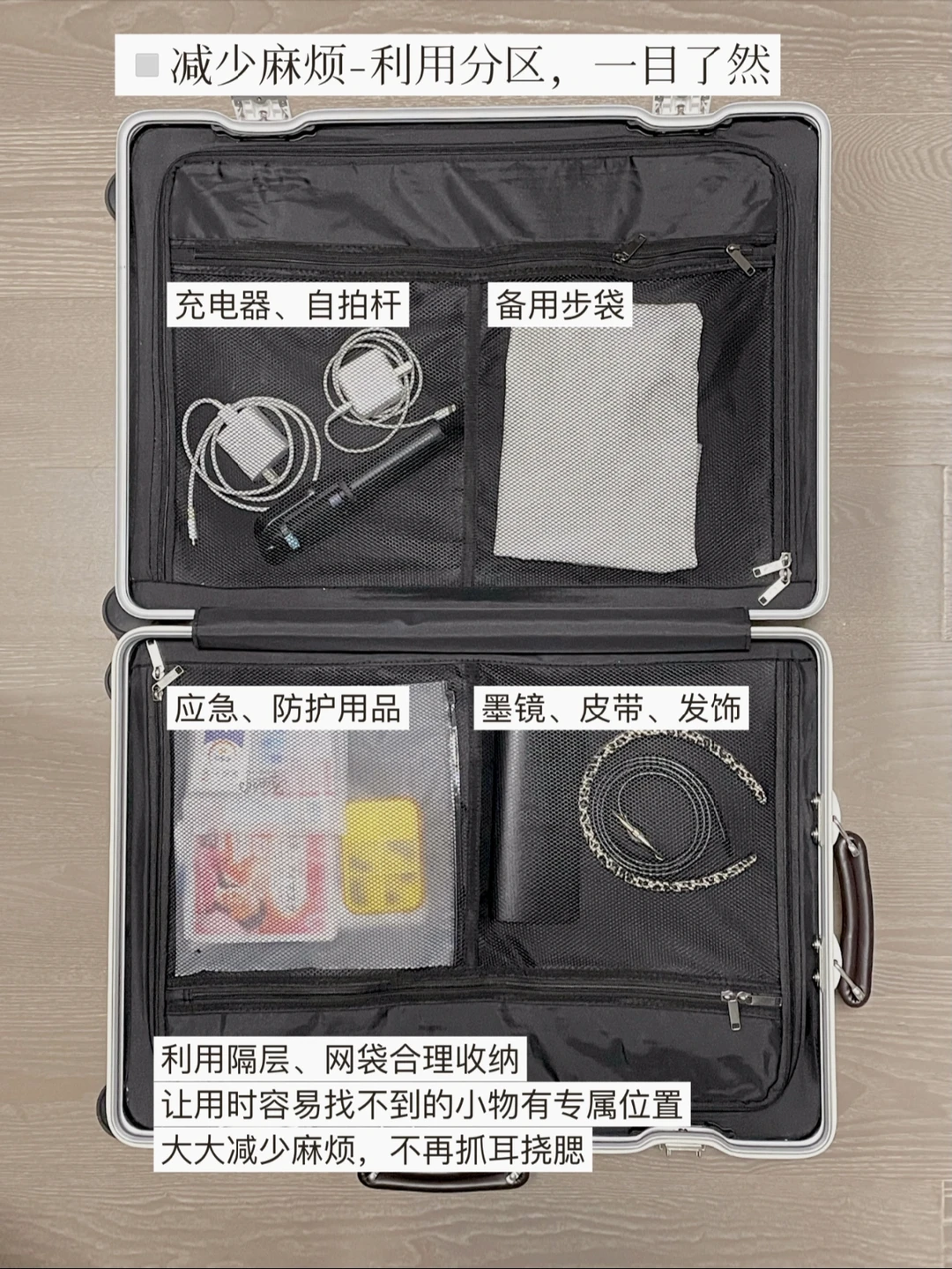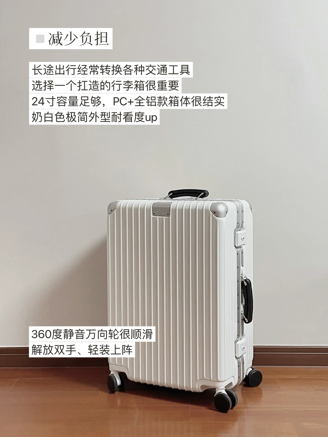 生活需要做减法,出行也是。 出行前做好减法,才能更好地享受整个旅程。 . 实用主义更关注体验和效率。分享我的5个精简出行减法: . ▫️【减少纠结】-提前列好出行清单 列一个完整的清单,每次出行对照勾选即可 ①必需/习惯用的且不好买的→带 ②可能需要的且不占空间的→带 我把物品按优先顺序分为6类,不用再苦思冥想忘了什么,减少纠结,节约时间,效率更高。 . ▫️【减少负担】-选择实用的行李箱 出行需要轻装上阵、解放双手。 长途出行经常换各种交通工具,我会选择一个扛造的行李箱。24寸的网易严选小金刚容量够用,PC+全铝框箱体也足够结实抗造;简约百搭又不贵,小几百元性价比很高。 尤其喜欢它的360度静音万向轮,比以前用过的都要顺滑,走在路上也不会因为轰隆声觉得尴尬。 . ▫️【减少麻烦】-模块化打包不易乱 ①高频拿取的证件、电子产品等放在随身小包 ②护肤品、化妆品、衣物等分类装好,方便查找③充分利用行李箱的隔层分区,固定更牢不易乱 . ▫️【减少浪费】-物尽其用,少额外买 不用为旅行专门购置旅行装或收纳用品 ①服饰包装的布袋、拉锁袋都可以重复利用 ②护肤品携带小样更轻便也不占空间 ③带个充电宝真的很有必要,租充电宝实在太贵 . ▫️【减少不确定】-出门前确认和检查 最后,别让不确定扰乱了好心情。出门前: ①确认好车票、酒店、路线信息 ②查询往返地的天气和口罩要求 ③清理冰箱食物和垃圾 ④关好门窗、检查水电气 ⑤告知必要的亲友和同事 . 谢谢你看到这里 ᵕ̈ 下次见~🤍