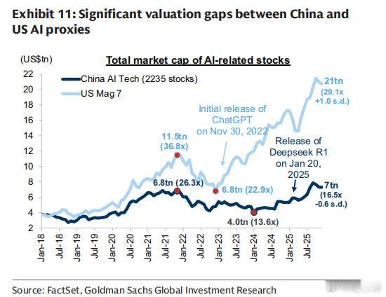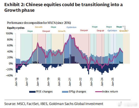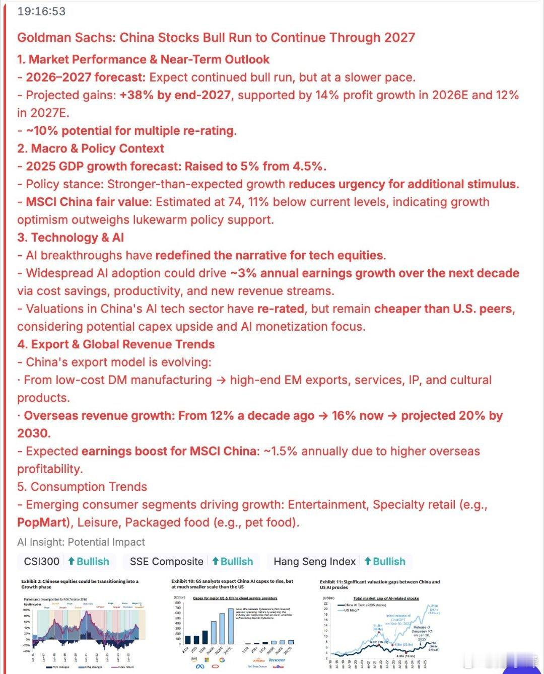 高盛:中国股市牛市将持续至2027年1. 市场表现与短期展望- 2026—2027年预测:预计牛市将持续,但步伐会放缓。- 预计收益:到2027年底增长38%,由2026年预期的14%利润增长和2027年预期的12%利润增长支撑。- 市盈率重估潜力约为10%。2. 宏观与政策背景- 2025年GDP增长预测:从4.5%上调至5%。- 政策立场:强于预期的增长降低了额外刺激的紧迫性。- MSCI中国公允价值:估计为74,比当前水平低11%,表明增长乐观情绪超过了温和的政策支持。3. 科技与人工智能- 人工智能的突破重新定义了科技股票的叙事。- 广泛采用人工智能可能会在未来十年通过成本节约、生产力和新的收入来源推动每年约3%的盈利增长。- 中国人工智能科技行业的估值已经重新评估,但考虑到潜在的资本支出上升和人工智能货币化重点,仍比美国同行便宜。4. 出口与全球收入趋势- 中国的出口模式正在演变:·从低成本发达市场制造业出口→高端新兴市场出口、服务、知识产权和文化产品。·海外收入增长:从十年前的12%→现在的16%→预计到2030年达到20%。- 预计MSCI中国盈利增长:由于海外盈利能力提高,每年约1.5%。5. 消费趋势- 推动增长的新兴消费群体:娱乐、特色零售(例如泡泡玛特)、休闲、包装食品(例如宠物食品)。