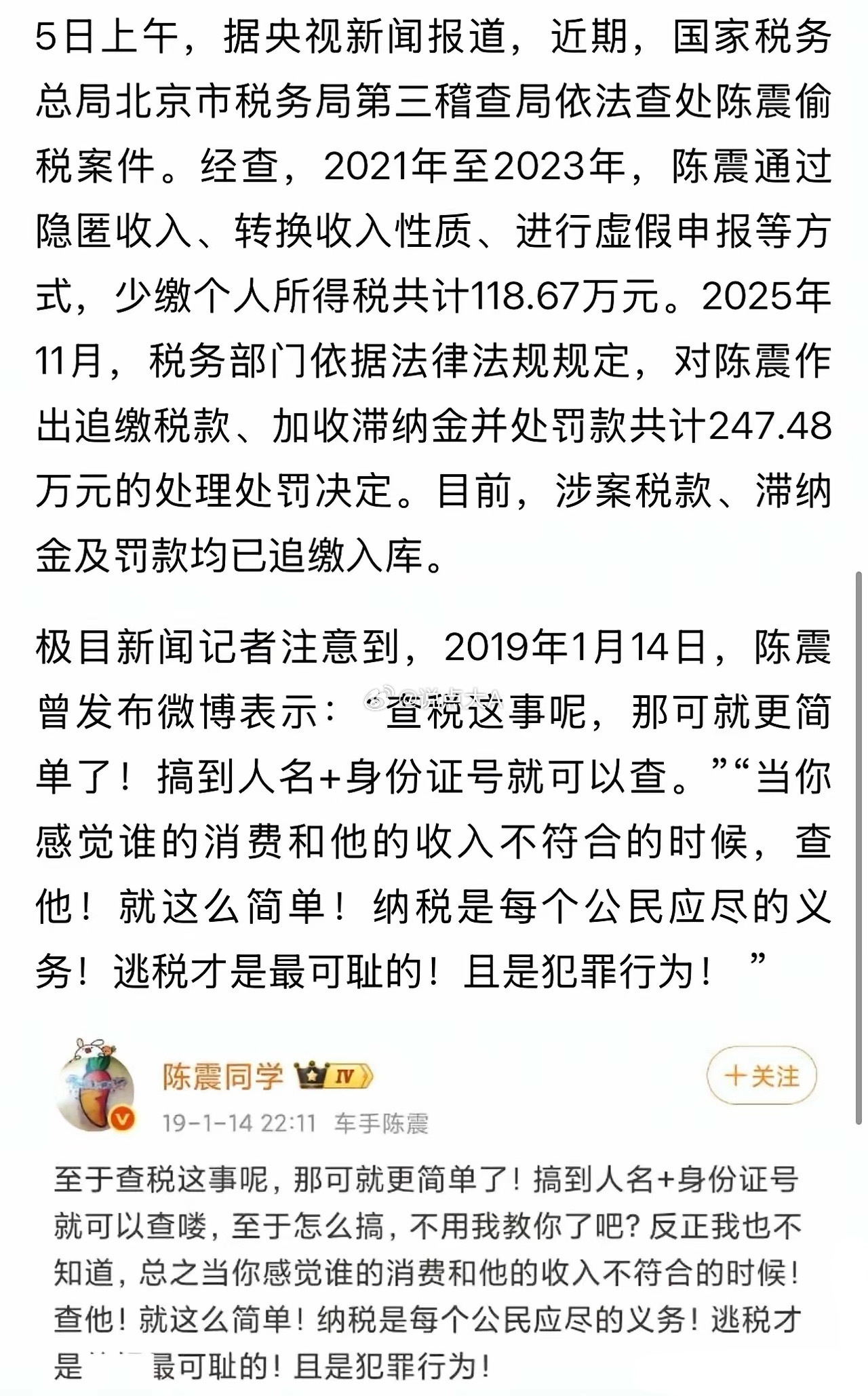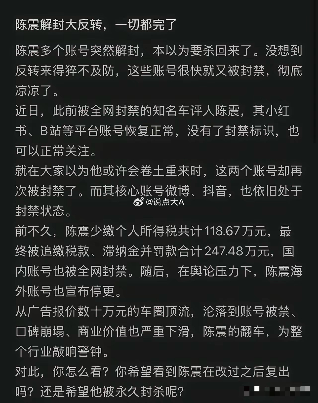 陈震的账号解封了没几分钟,就又被封禁了,大家猜测可能是跟平台方沟通之后提现账号上的所有收入,然后平台给了一点时间让他操作。也有可能是陈震背后有靠山给他说情了,尝试给他解封探探舆论风向,结果没想到大家对他的意见蛮大的,平台就只好再把他封禁了。最后一种可能就是,平台也不知道有关部门对他的态度,试着解封试探一下审核尺度,结果有关部门不给机会。陈震跟小米、华为有很多千丝万缕的联系,作为大V也有着非常高的收入。我个人认为,如果是主观恶意逃税,应该坚决予以彻底封杀,如果只是因为税务知识匮乏造成的疏漏,可以像宋祖儿一样,给一个重新来过的机会。