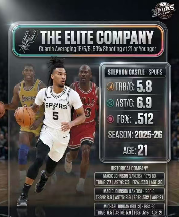 大家都说2024年是选秀小年,而最近就有媒体给出了24年最佳新秀卡斯尔的数据。 本赛季卡斯尔目前场均能得到18.3分5.8篮板6.9助攻,投篮命中率51.2% 而在联盟中,21岁以前场均至少能拿到18分5篮板5助攻,且命中率超过50%的球员只有三位 那就是卡斯尔(24-25赛季)、魔术师约翰逊(79-80,80-81赛季赛季)和乔丹(84-85赛季)!