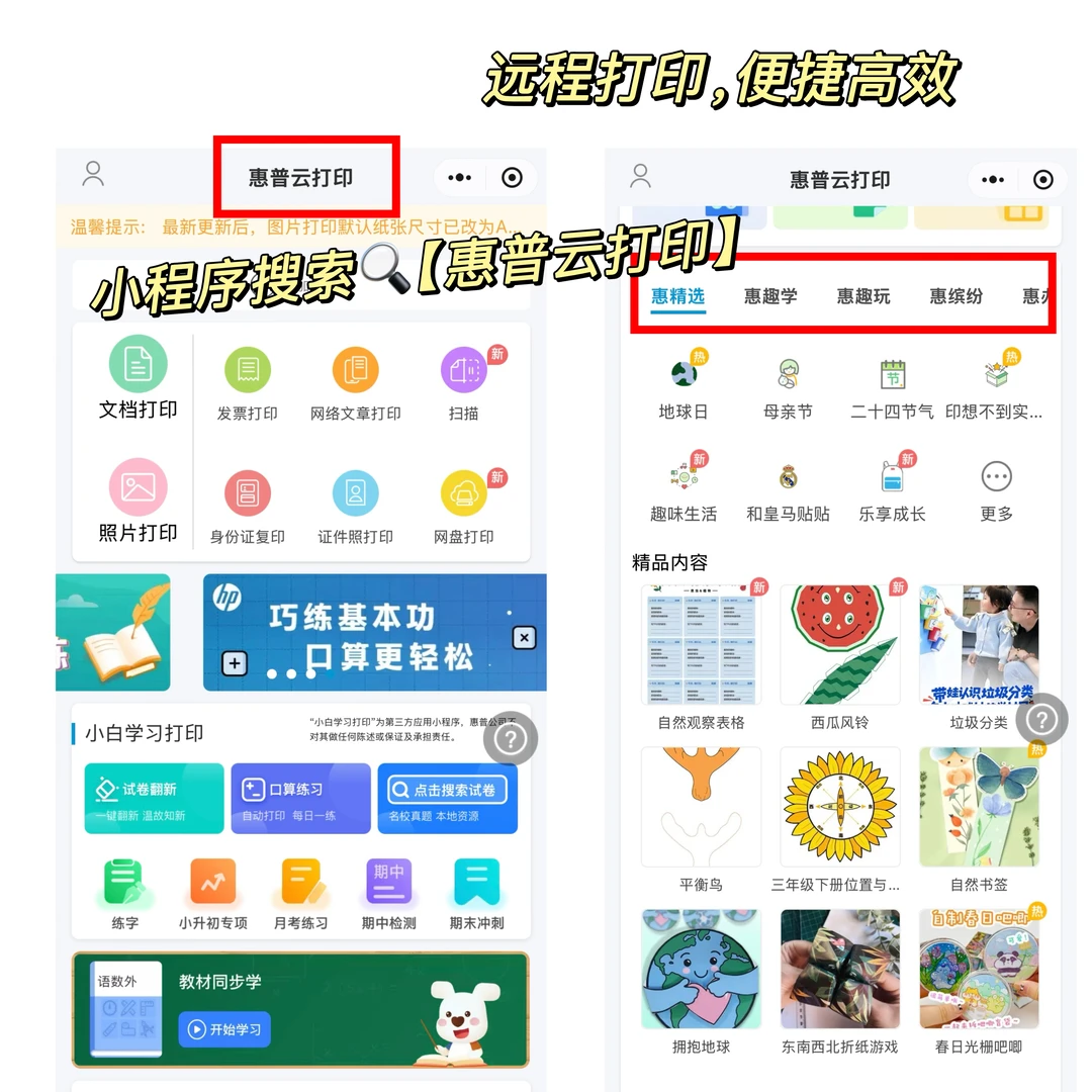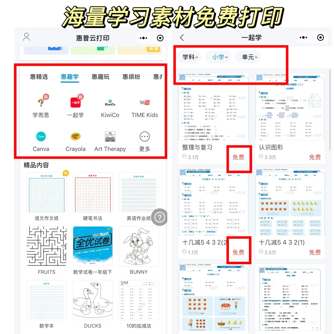 ✨海量素材免费打印: v搜索🔍【惠普云打印】小程序,里面有适合中小学生的多学科资料,海量学习素材都可以免费打印。