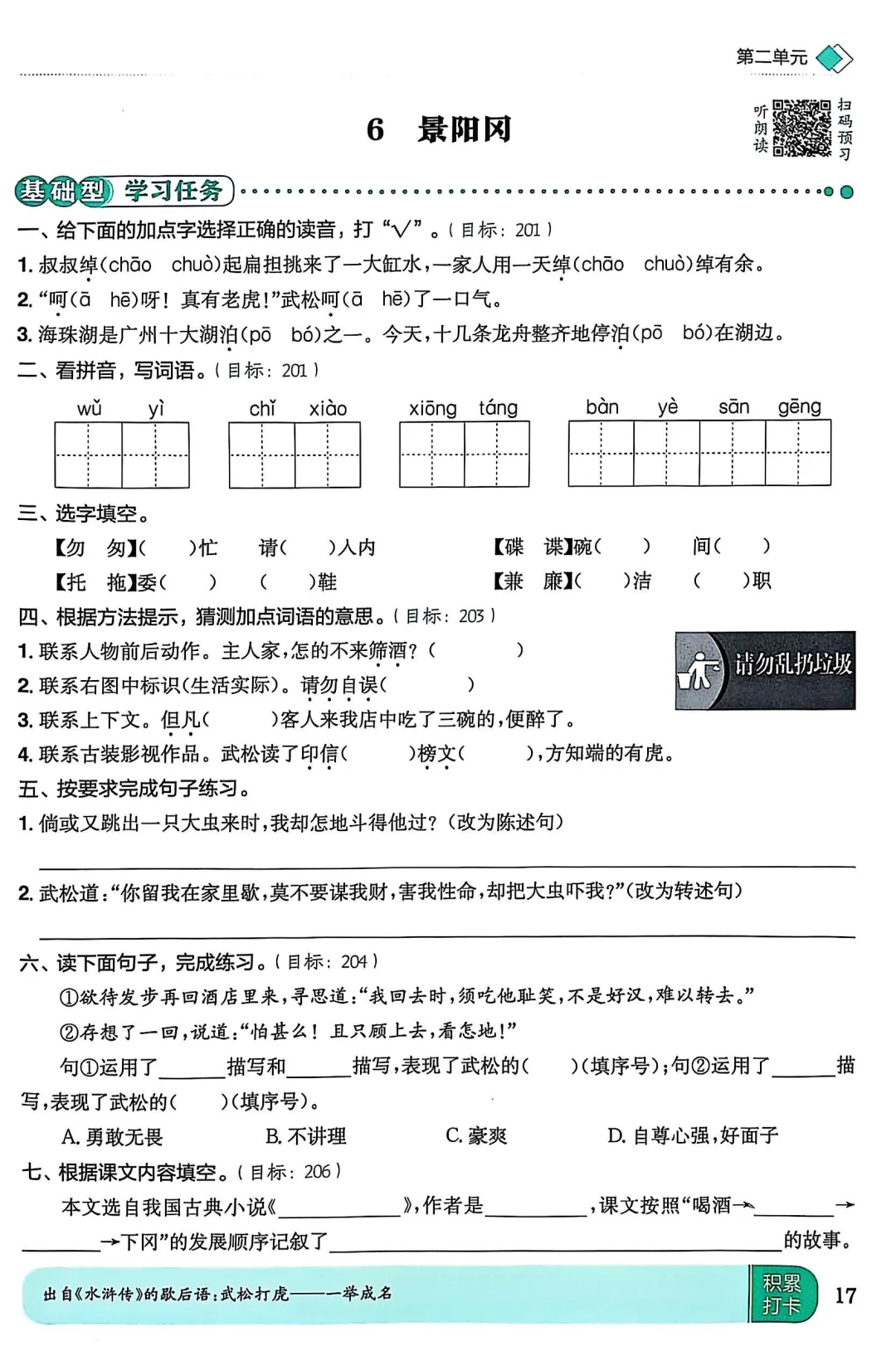 1.认识“倚、箸”等生字,读准多音字“绰、呵、泊”,会写“风、饥”等字,会写“半夜三更、寻思”等词语。