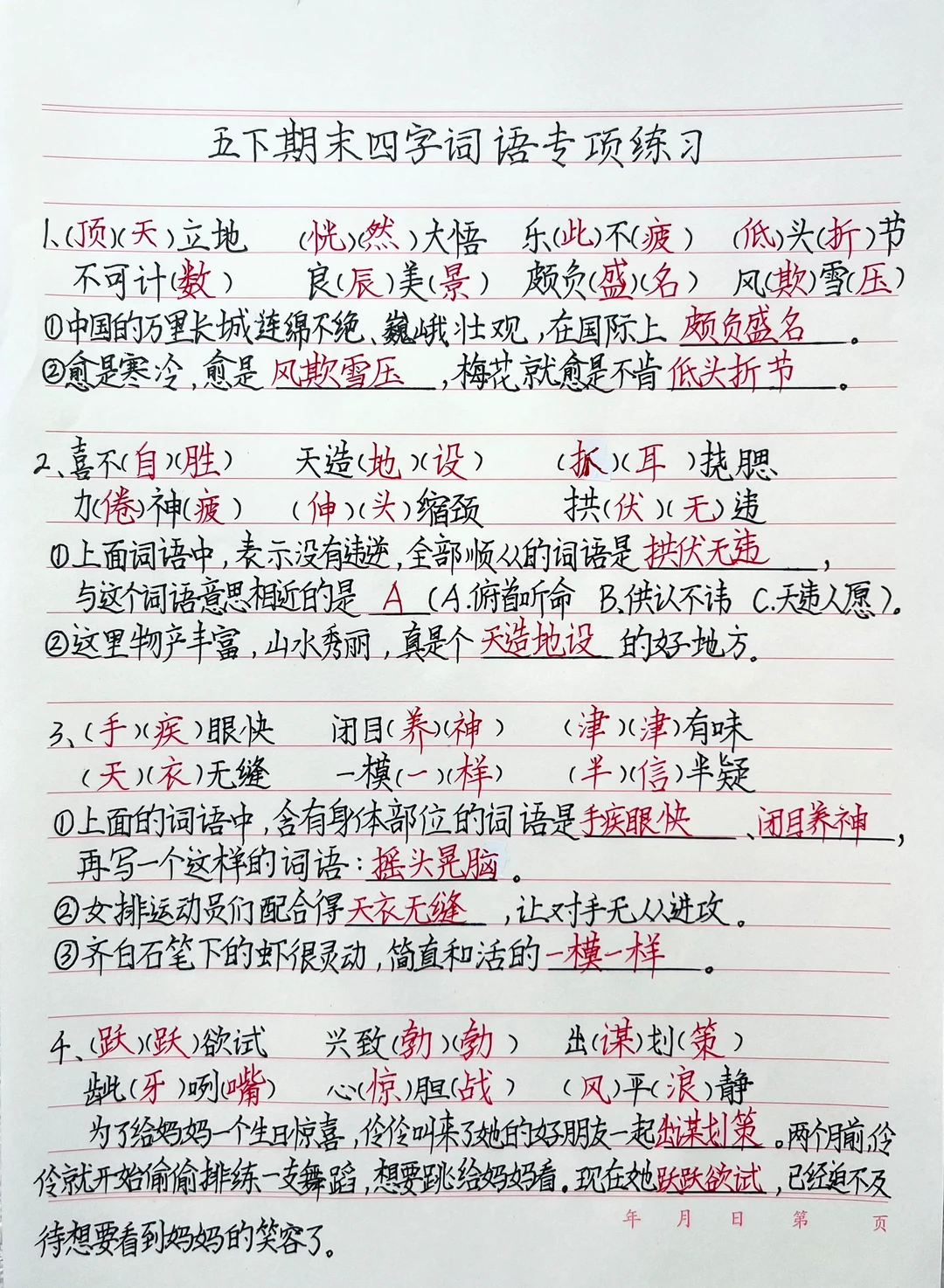 五下语文期末复习四字词语专项训练(附答案