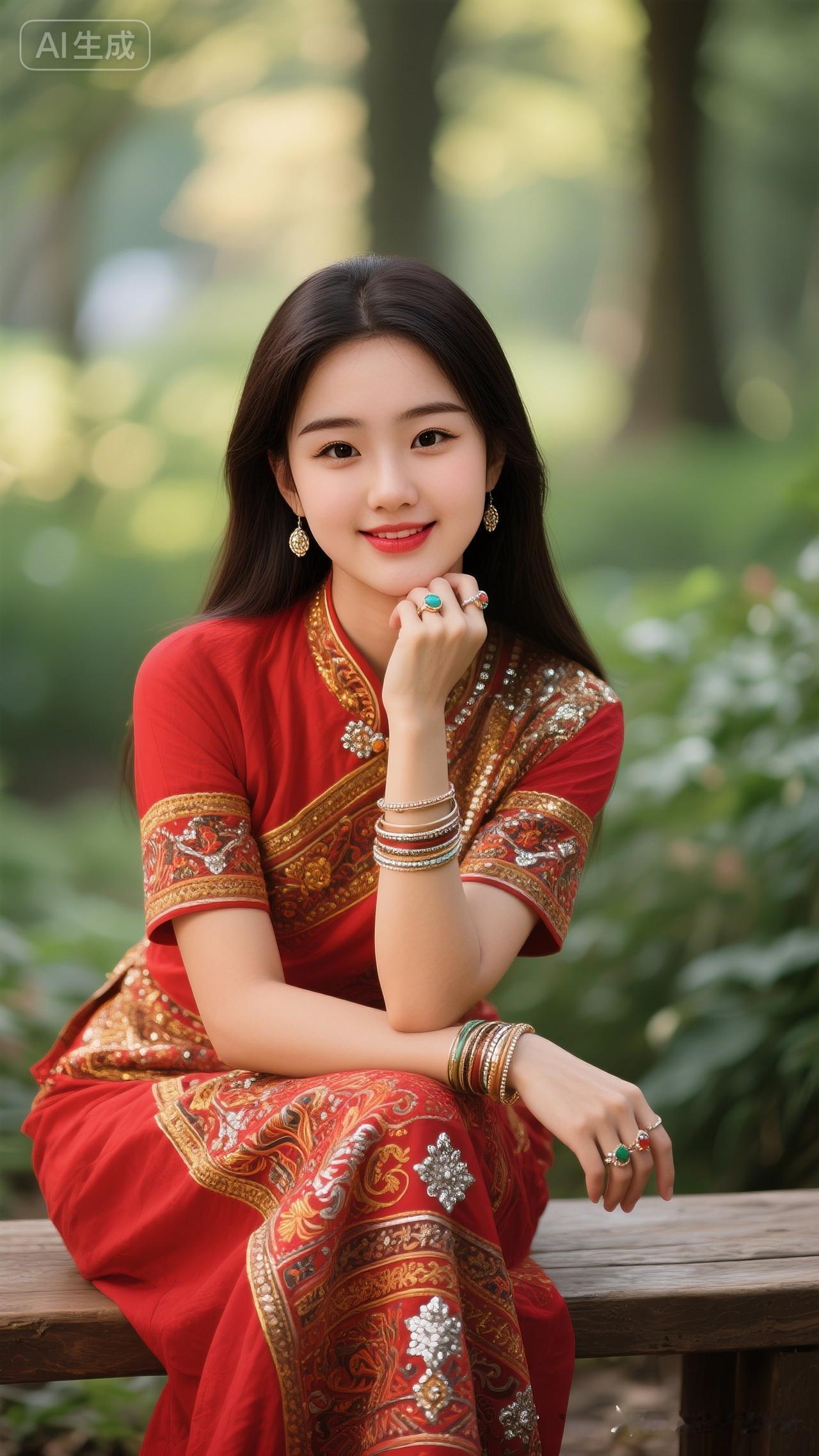 年轻女子坐木凳上,身着鲜艳红色传统服饰,饰有金银纹样,深色长发整齐,手托下巴,手腕戴手镯,指间有戒指,面带微笑。
