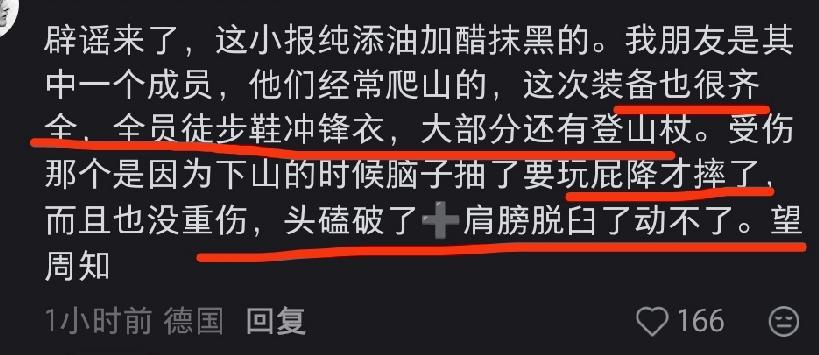 德媒Blid(图片报)一点都不靠谱,报道歪曲事实,说8名鲁莽的中国青年只穿运动鞋和单薄衣服登山,其中一人头部严重受伤。 幸亏有知情人在评论区辟谣,说这帮年轻人并不是登山小白,装备正常,穿的是冲锋衣登山鞋。 受伤那个也不严重,想玩儿一次野外滑梯式下山,意外磕破了头,肩膀脱臼,但并不算严重。 他们是在巴伐利亚州施利尔湖山地从某山脊上下撤时出的事。 Blid报还说他们是从网上找的徒步路线,但其实这条路线并不存在。 不管怎样,平安就好! 儿行千里母担忧,在外的孩子们做什么都请慎重再慎重,多想想家里父母。