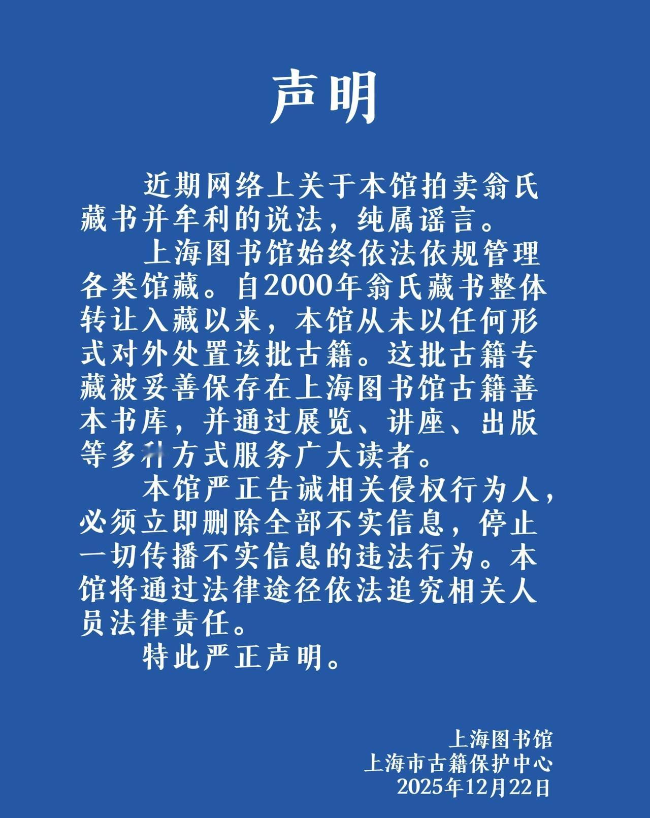 上图的声明,蓝底白字,不管是配色还是字体,让人看着都很舒服,不刺眼。 一颗老鼠屎会坏一锅粥,南博的事对其他藏馆影响不小,很难不产生蝴蝶效应,引起一些人猜疑,这时候发声明很及时。 不少网友都夸上海图书馆对捐赠物品还是很用心地在管理,几任馆长都很严谨敬业。 收藏古籍古画和其他艺术品,相当于在保护和延续一段段有价值的历史。 论保管,公家的馆院肯定比家族上下传递的方式更有能力。 宝贝送进去有据可查,宝贝的去向透明,捐赠人进藏馆看自己捐的东西不用买票,东西真伪残缺还是剔除销毁都能给原主及后人明确而详细的说明,才能皆大欢喜啊!