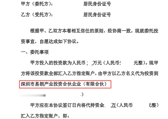 一名投资者提供的代持协议显示,投资人将资金汇入代持人指定账户,由代持人以其名义投资于深圳市易朗产业投资合伙企业(有限合伙)。