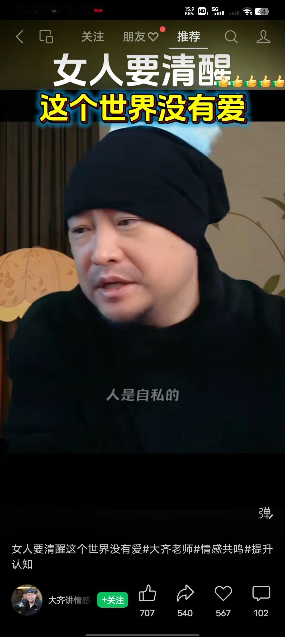 我曾经刷到过这样一个视频,一位博主声嘶底里的劝说着所有的女性,“清醒一点好不好?这个世界没有爱,爱都是自私的,所谓的爱就是建立在别人的包容自私和痛苦之上的,我说过无数次了” 爱说起来很伟大,但做起来很自私,我们所求的爱,只不过是对别人的要求包容,还有是成全自己的自私,你爱我就要包容我所有的一切,听起来多像霸总的爱呀,可是这样的爱有几个人能承受得起呢?爱不应该是这个样子的,应该是双向奔赴的,难道别人爱你就活该别人要承受痛苦吗?难道也是别人一味的付出吗?这样的爱能维持的住吗?能持续的长久吗? 我觉得这样的爱不是任何人能承受得起的,能坚持的住的,如果你的爱只能给别人带来痛苦和压力,就算能维持住一时的新鲜,我相信这种爱没有人能坚持多久。别把爱说的那么高大上,要做到相互的成就,相互的体谅,相互的包容才是长久之计!