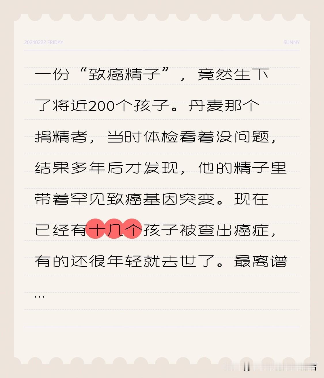 一份“致癌精子”,竟然生下了将近200个孩子。丹麦那个捐精者,当时体检看着没问题,结果多年后才发现,他的精子里带着罕见致癌基因突变。现在已经有十几个孩子被查出癌症,有的还很年轻就去世了。最离谱的是,这些精子被卖到十几个国家,各国之间没有统一的追踪和预警机制,很多父母很晚才知道真相。本来是想通过捐精圆一个做父母的梦,结果变成一辈子的噩梦。这事儿也给所有人提了个醒:辅助生殖的安全和监管,真的一点都不能马虎。