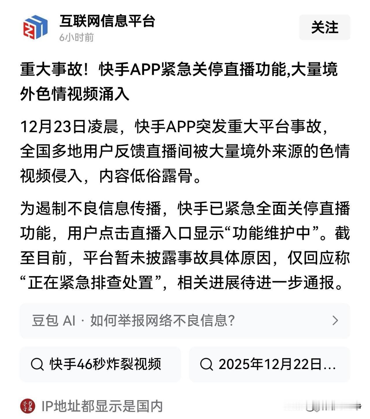 这是非常严重的黑客入侵事件,甚至可以说这就是网络战争。 23号晚间快手平台突然遭到境外黑客的进攻。 大量直播间被强行插入了很多淫秽的视频。 战争啊,这就是互联网战争。 今天他们可以用色情视频入侵门户平台。 明天他们就可以用反动反政府的视频入侵咱们的互联网。 这种行为如果不反击的话。 敌人的气焰会无比的嚣张。 这种事情说实话已经不光是警方的事儿了。 军方还有国家安全部门必须要出手。 不仅要堵住漏洞,关键的时刻应该对他们进行反击。 咱们的红客应该把国内很多美国斩杀线的视频。 反向输入到美国去。 同样用黑客的手段直接攻击他们的门户网站。 必须得打成一个有来有往。 实在不行咱们可以考虑一下恢复输出革命。