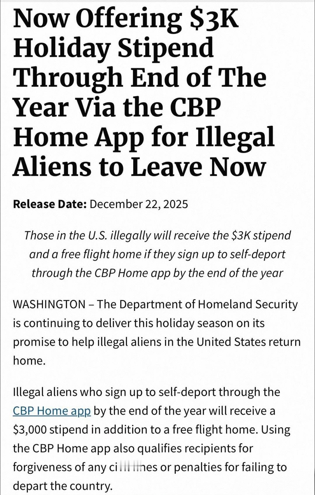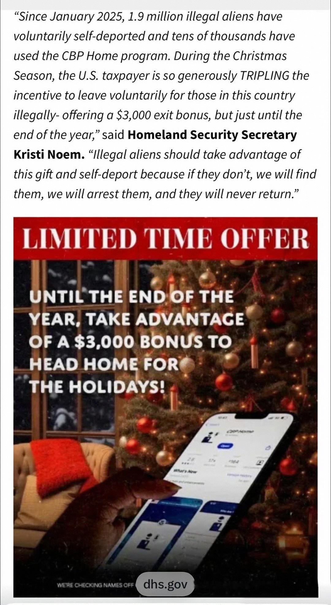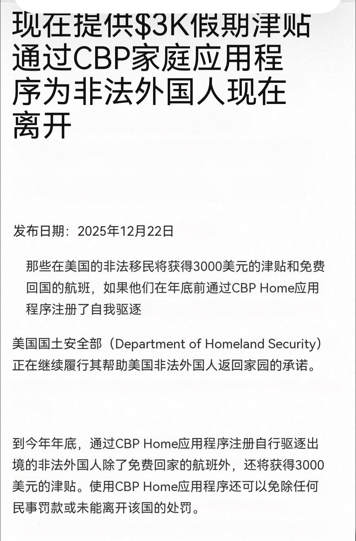 据12月22日美国国土安全部部长克里斯蒂诺姆接受采访:自2025年1月以来,190万非法外国人自愿自我驱逐,数万人使用CBP Home计划。在圣诞节期间,美国纳税人非常慷慨地鼓励自愿离开这个国家的非法移民-提供3000美元的退出奖金,但直到年底,非法外国人应该利用这个礼物并自我驱逐,因为如果他们不这样做,我们会找到他们,我们会逮捕他们,他们永远不会回来。限时优惠直到年底,利用3,000美元的奖金回家度假!我们正在检查名字dhs.gov网站不是我们找到的下一个名字。也就是说离最后的期限不足10天,但如果真的想离开,时间是够的。这样看来美国人挺仁慈的,花3000美元自动离境,这些非法少用水、少用电,少用公共设施,社会冲突也少了,社会治安也好了,美国简直赚爆了。可是美国人你们要自己多生好生呐,否则这么富庶的美国谁来建设、谁来继承呢?