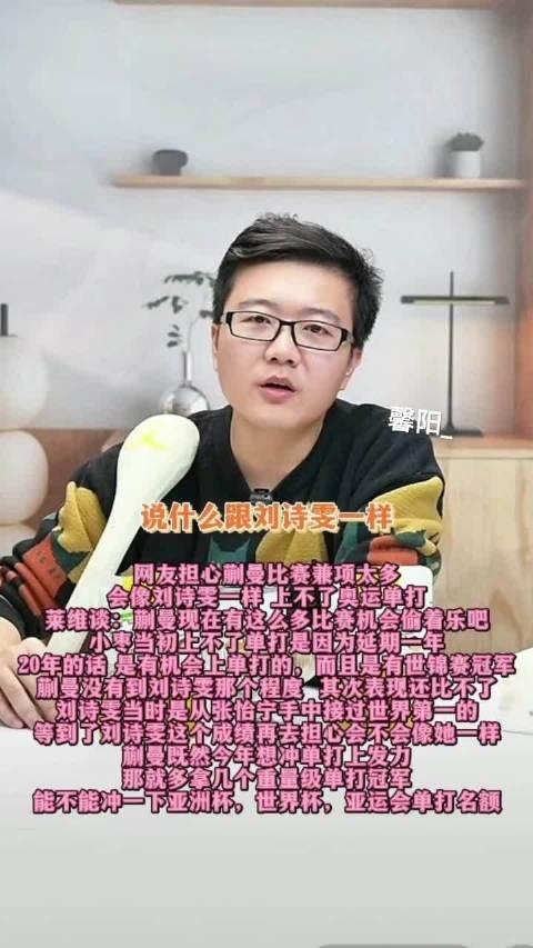 莱维谈蒯曼奥运单打前景,建议多拿重量级冠军 网友担心蒯曼比赛兼项太多,会像刘诗雯一样 上不了奥运单打!莱维谈:蒯曼现在有这么多比赛机会偷着乐吧小枣当初上不了单打是因为延期一年20年的话 是有机会上单打的,而且是有世锦赛冠军蒯曼没有到刘诗雯那个程度 其次表现还比不了刘诗雯当时是从张怡宁手中接过世界第一的等到了刘诗雯这个成绩再去担心会不会像她一样蒯曼既然今年想冲单打上发力那就多拿几个重量级单打冠军能不能冲一下亚洲杯,世界杯,亚运会单打名额