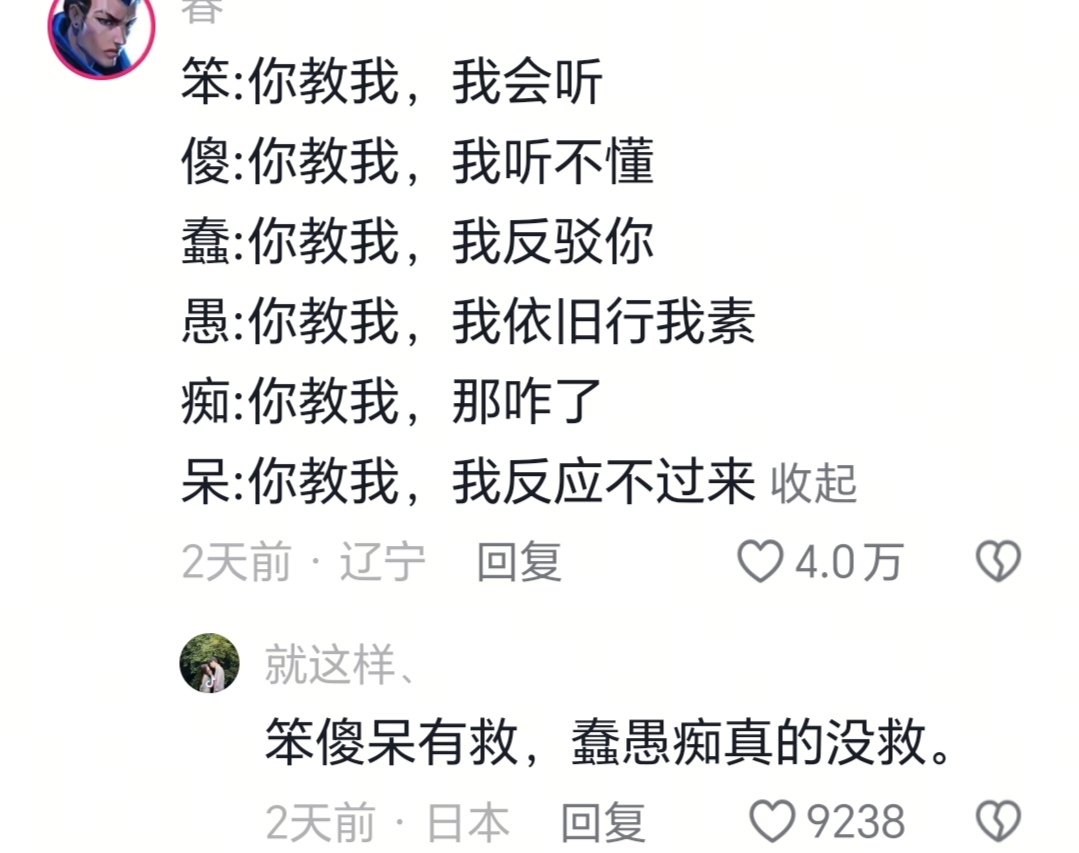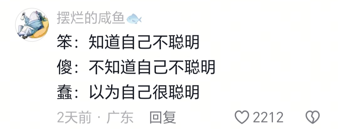 笨:知道自己不聪 傻:不知道自己不聪明 蠢:以为自己很聪明